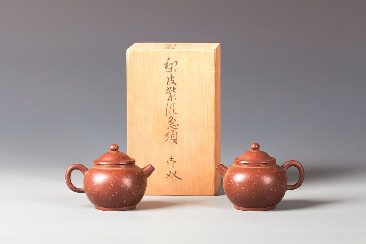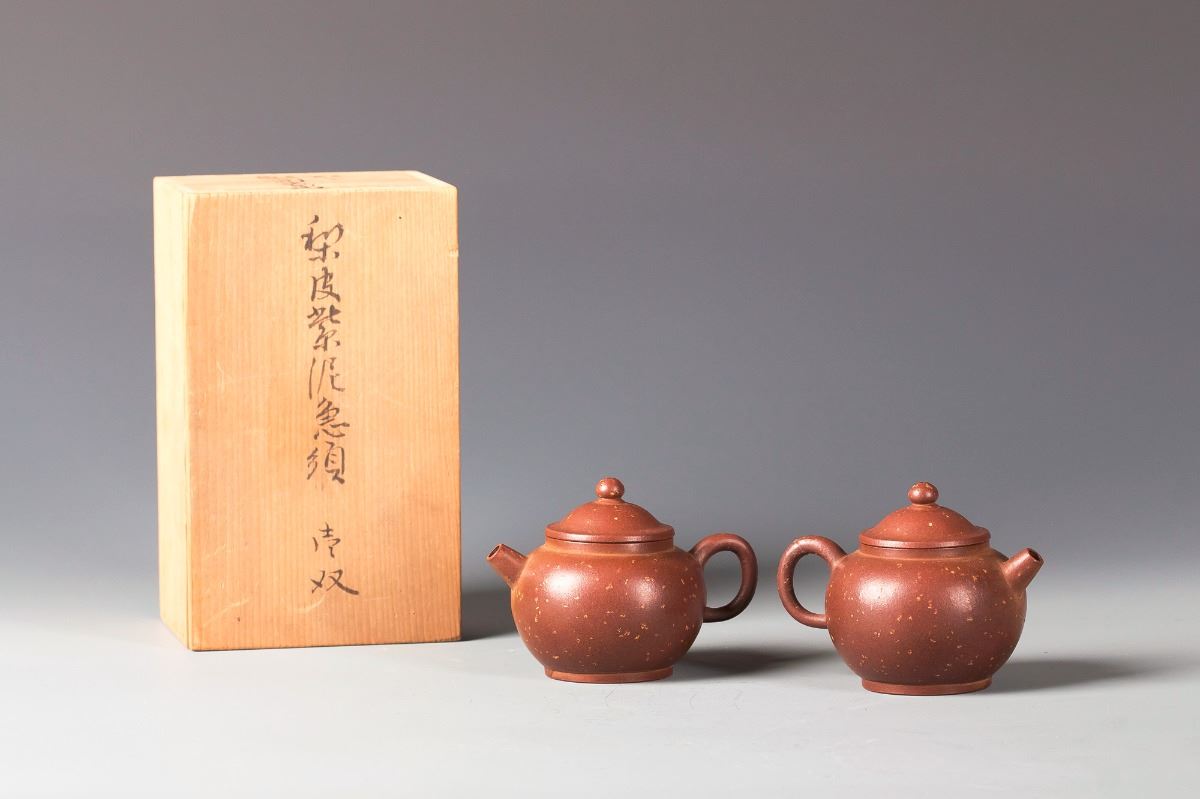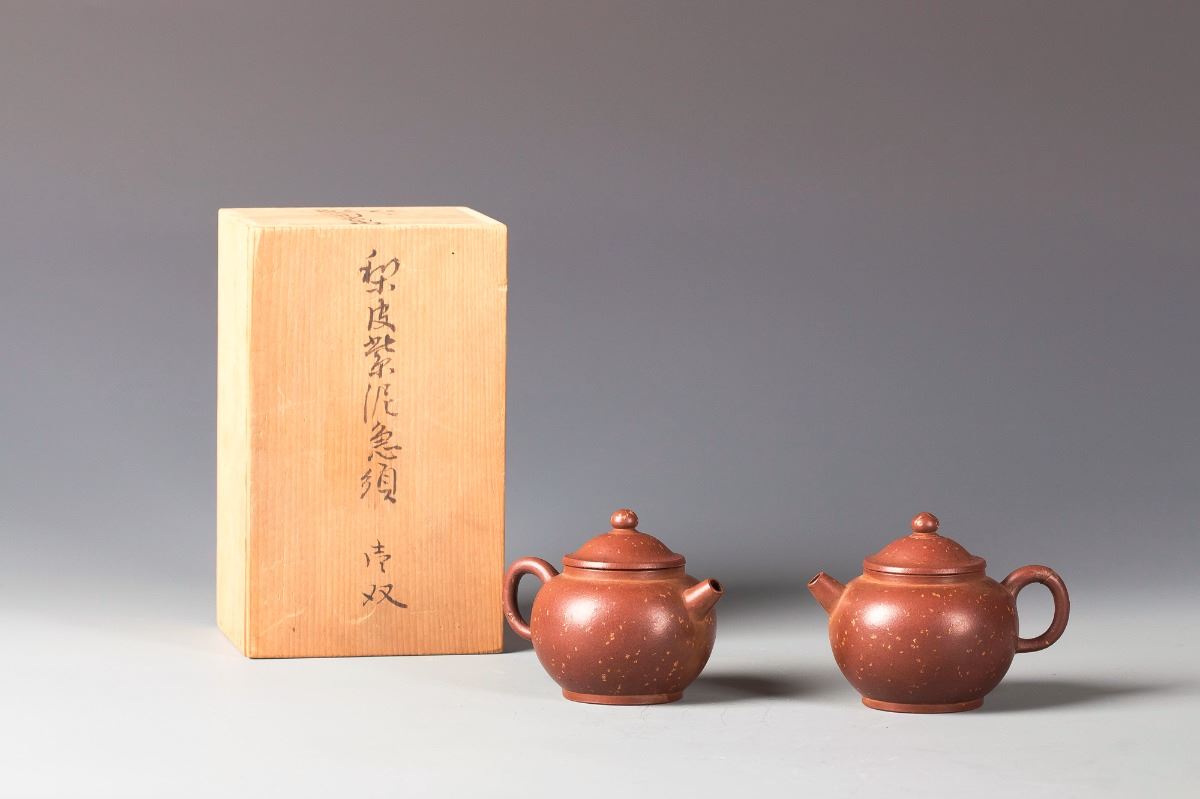 Pair of Chinese Purple Clay Teapot. Some yellow marks suffusion on the outside looking like a pear's skin. With spout, handle and lid. Can covered with a cuboid box.