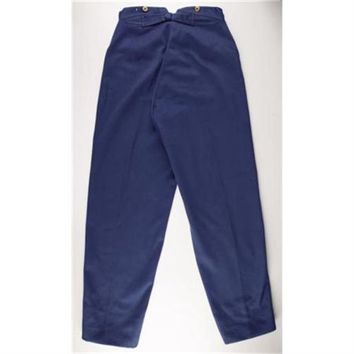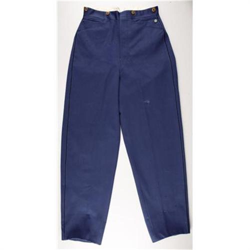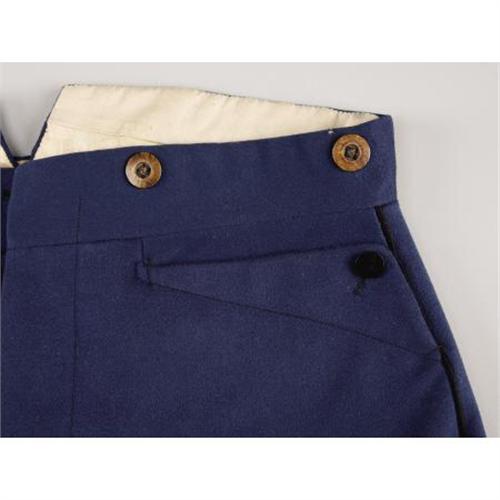 <B>PAIR OF CIVIL WAR PERIOD OFFICER’S TROUSERS.</B></I> Very fine quality blue wool with narrow black seam welt which extends to the base of the waist band. Cotton pockets, silk waistband. Burlap reinforcing inside the cuffs, polished cotton lining. Brown polished cotton reinforcing at four button fly. Split belted back with japanned adjusting buckle and brown polished lining on back of belt. All closure/ suspended and pocket closure buttons of tinted bone. The black seam welt probably represents either medical or staff. A classic pair of Civil War officer’s trousers in both form and construction and a style and color used by officers on both sides. <BR><B>Condition</B></I>: Very fine, just some tiny scattered moth holes, very minor. Some minor scattered stains on the cotton half lining, again inconsequential. Missing one of the suspender buttons and one pocket closure button broken in half but the detached piece is included. All stitching tight and sound. <BR><BR><b>Shipping:</b> Clothing, Costumes & Jerseys (<a target="_blank" href="http://www.heritageauctions.com/common/shipping.php">view shipping information</a>)