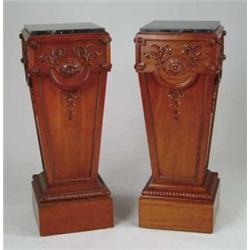 Lot # 1531 PAIR OF CLASSICAL STYLE MAHOGANY PEDESTALS. Square formed with black mottled marble inset tops, applied carving to a tapered square form on a molded square base. Late 20th Century. SIZE: 40-1/2” h x 15” sq. CONDITION: Very good. 9-99467 (1,000-1,500)