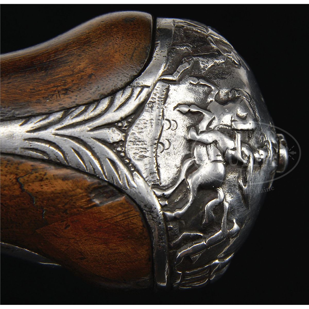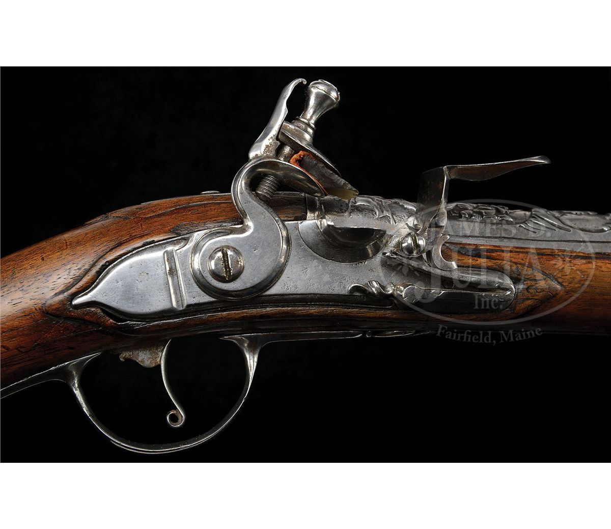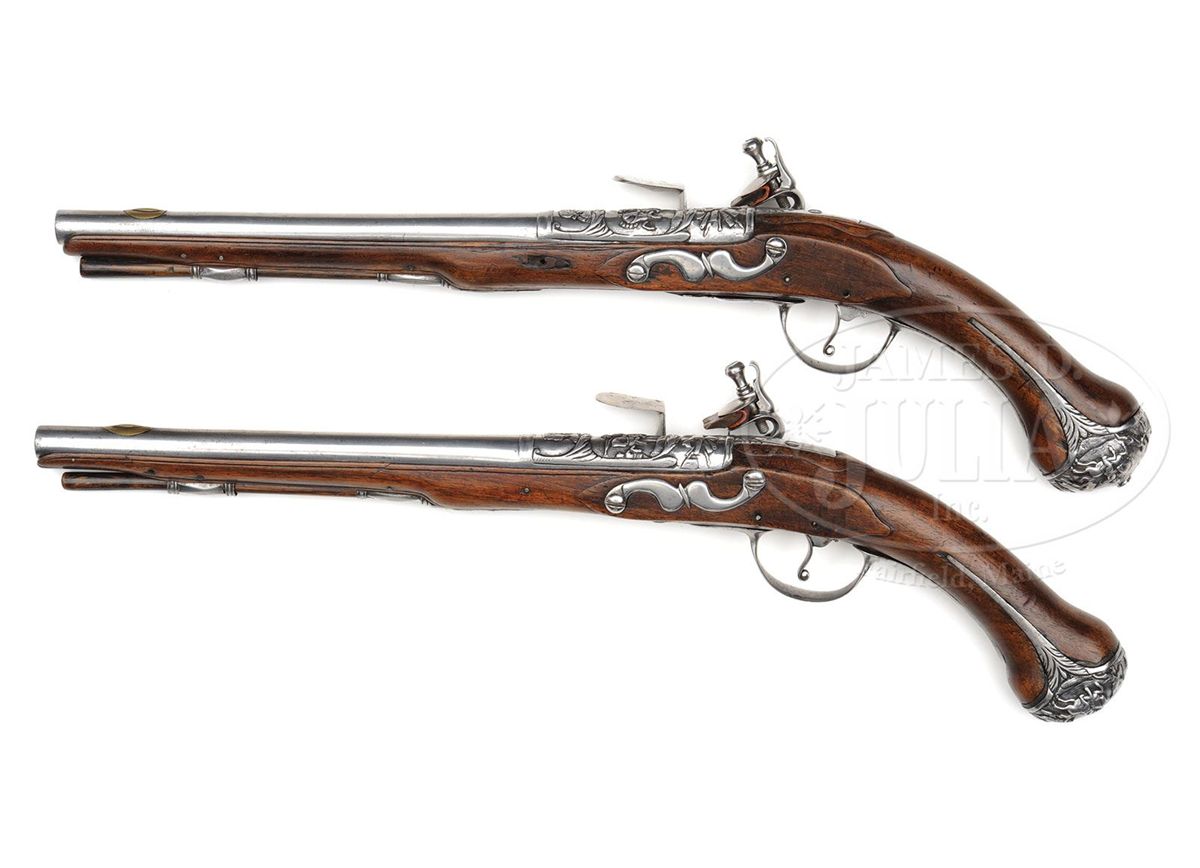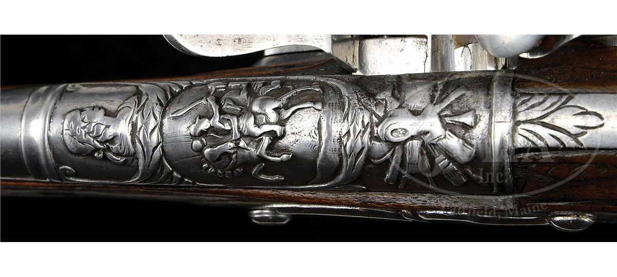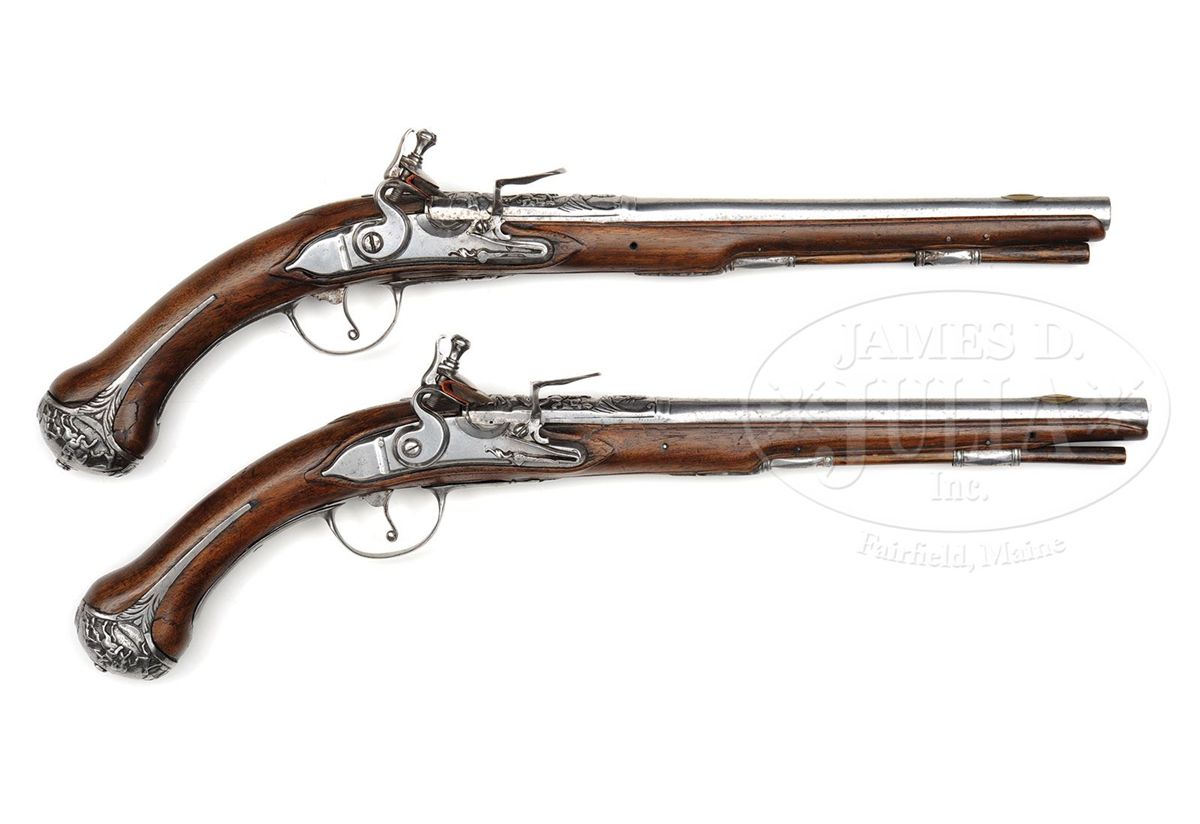 NSN. Stepped flat locks of almost military form have no decoration other than a filed frizzen spring. Bbls are chiseled with a female portrait and helmeted soldiers on horseback and a trophy of arms. Spurred butt caps are chiseled en suite with a battle scene. Walnut full stocks are molded around tang and side plates. NOTES: An interesting pair of flintlock holster pistols, which show some Dutch characteristics. PROVENANCE: Collection of Dr. Douglas Sirkin. CONDITION: Metal has been cleaned bright overall and raised chiseled work on bbls and butt caps is worn. Stocks have minor repairs on forend and are refinished throughout. Actions very crisp. 4-50037 MZ44