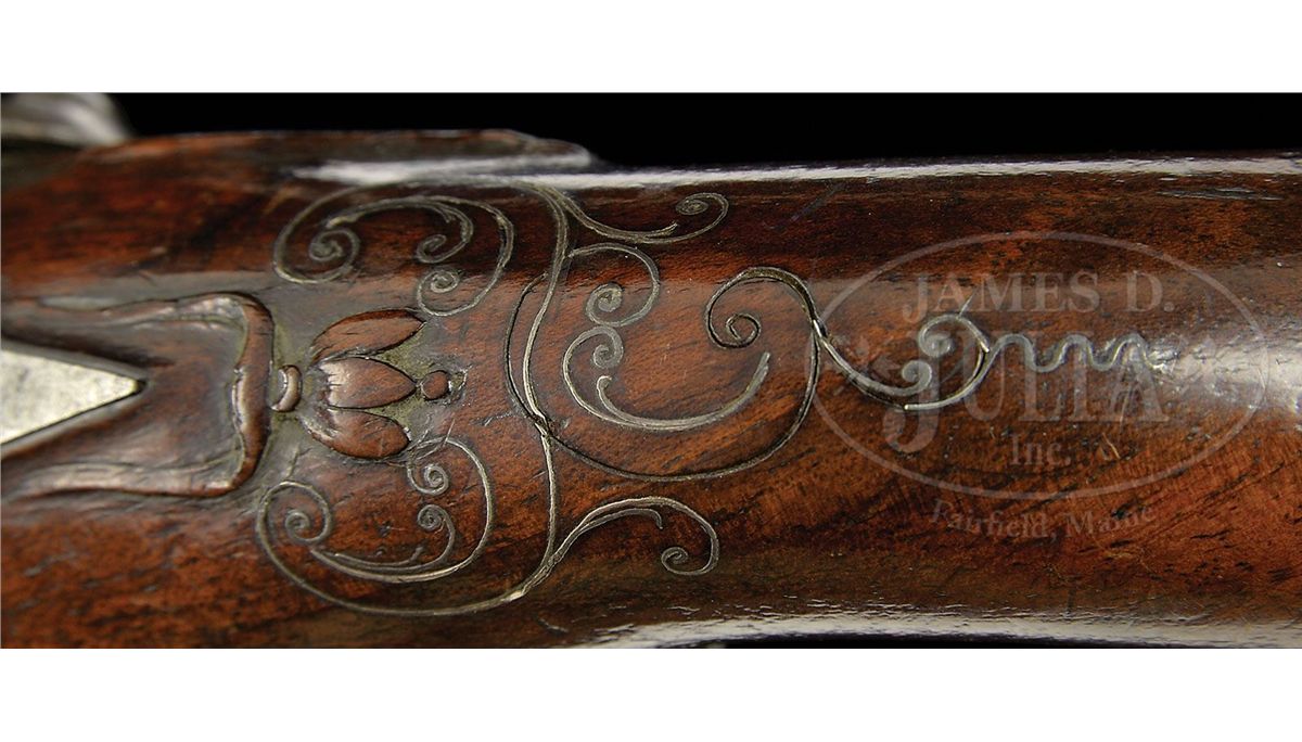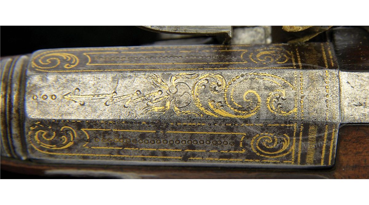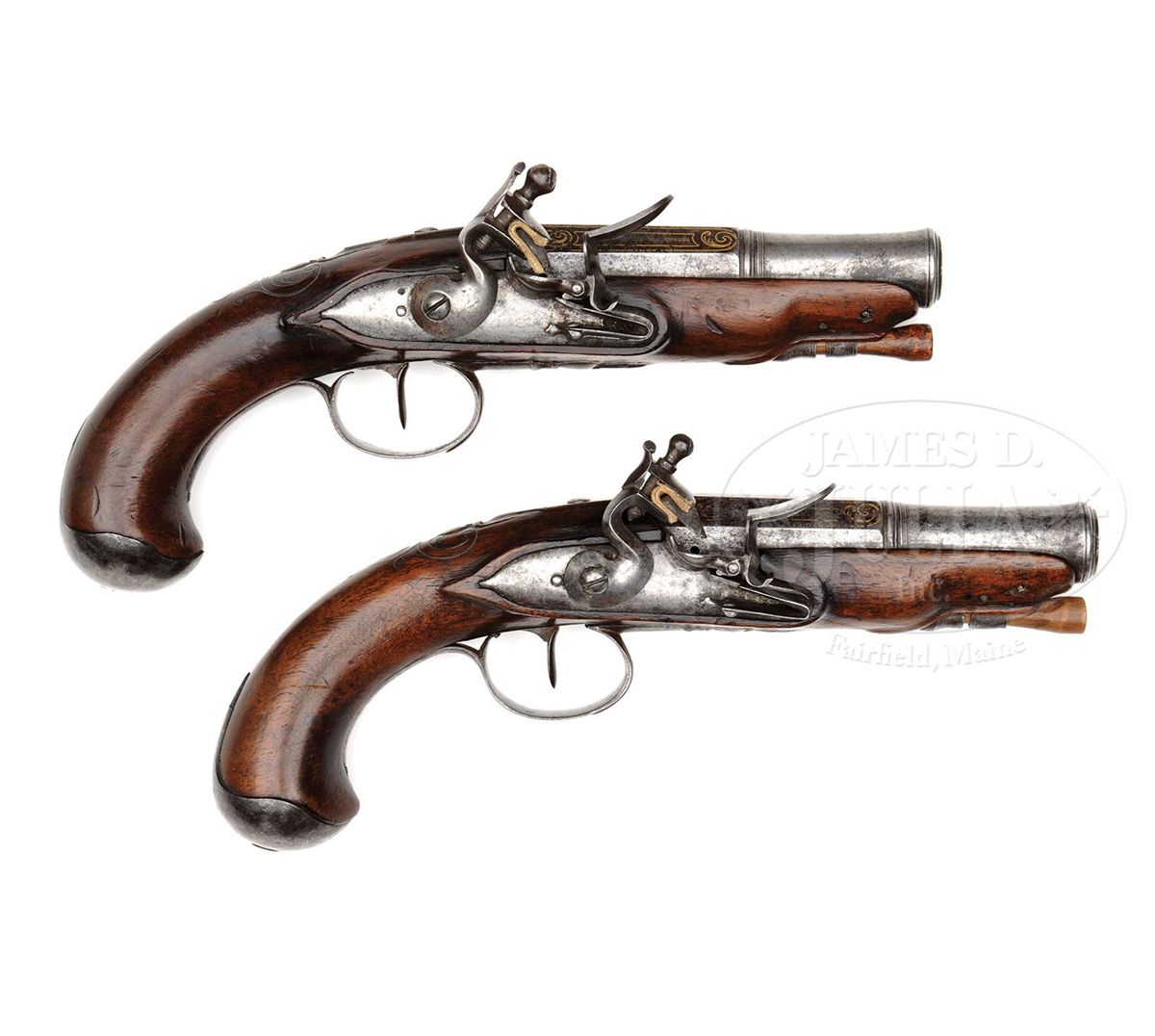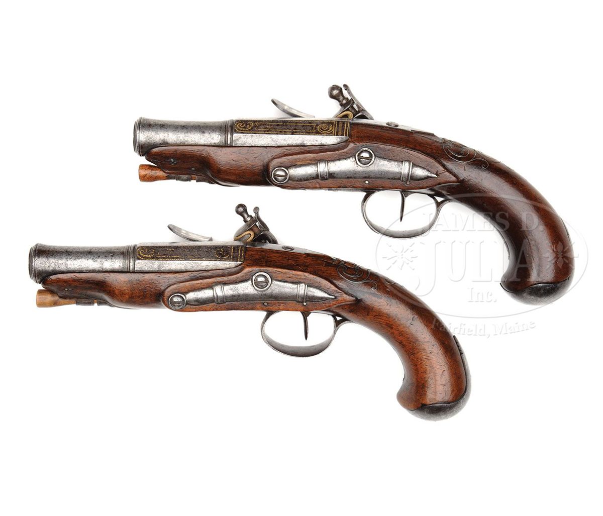 NSN. A good pair of this well known type with plain locks and gold damascene breeches. Plain iron furniture with birds head butt. The stocks of straight grain walnut with rudimentary caving behind tang and some silver wire work. An attractive pair of flintlock pocket pistols. CONDITION: One pistol with better gold damascene remaining, the other worn. Metal is smooth with no significant pitting. Stocks are very crisp with no damage. Silver wire mostly intact on one pistol with some wire missing from the other. 4-49392 MRZ84