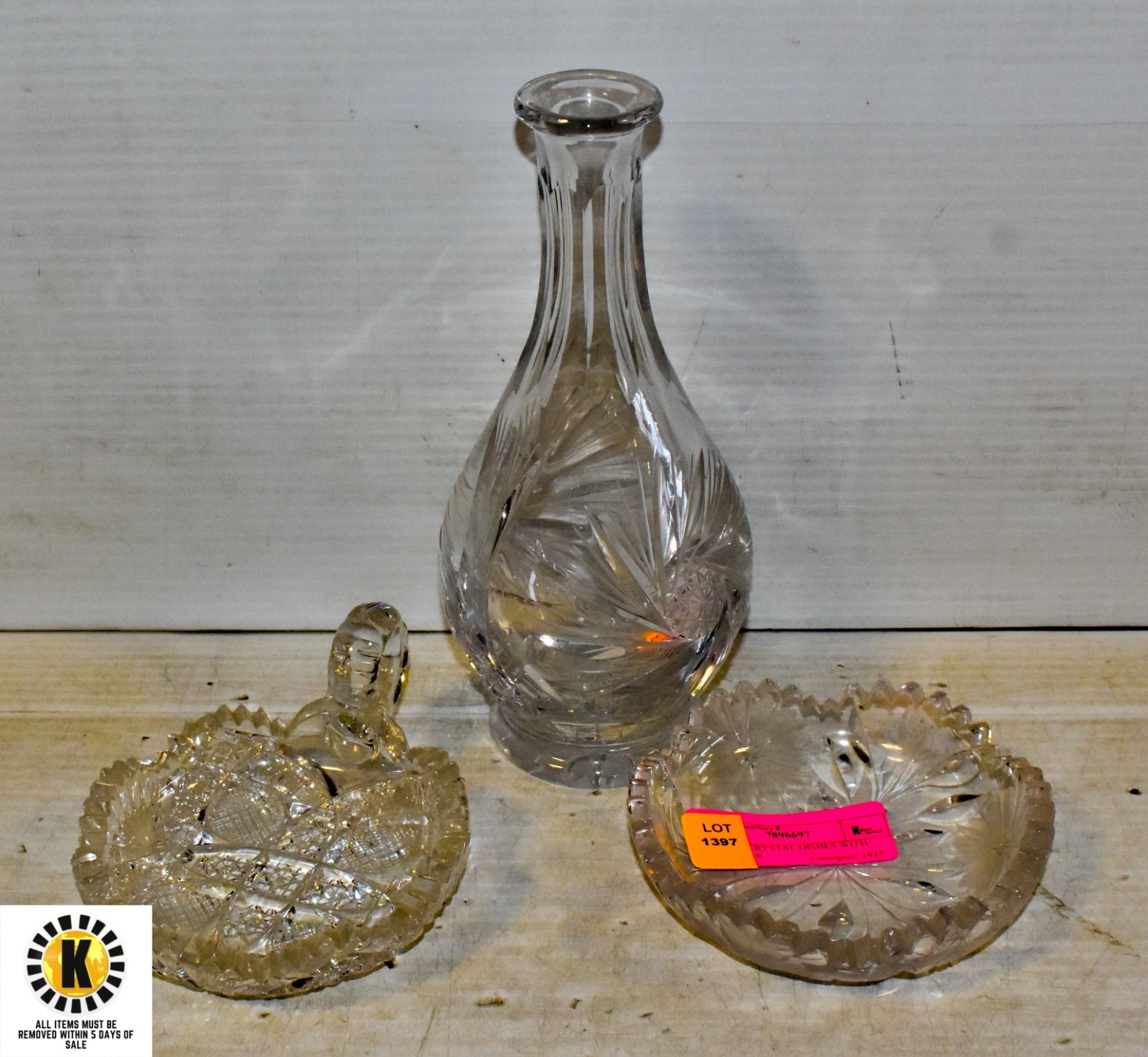 PAIR OF CRYSTAL DISHES WITH DECANTER