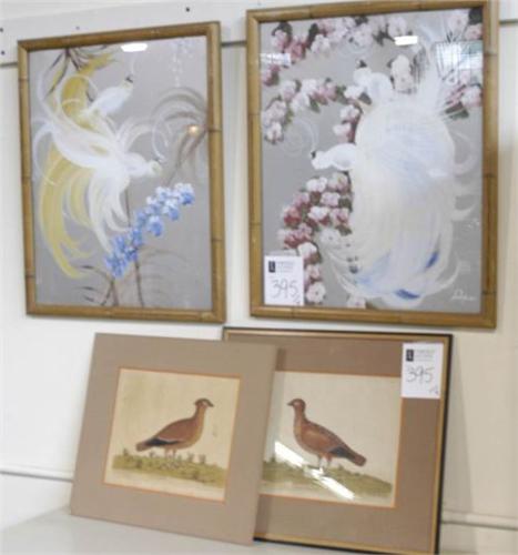 PAIR OF DECO GOUACHES together with a PAIR OF BIRD ENGRAVINGS, one unframed, SHIPPING: See recommended third party shippers. This item can't be packed or shipped by seller.,