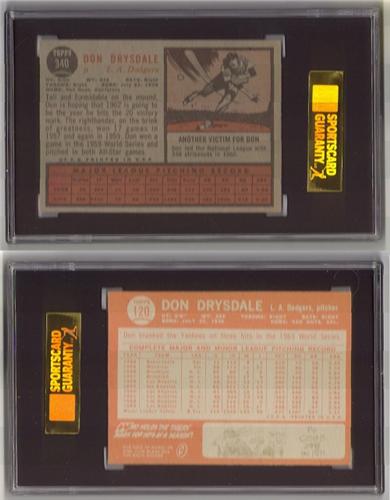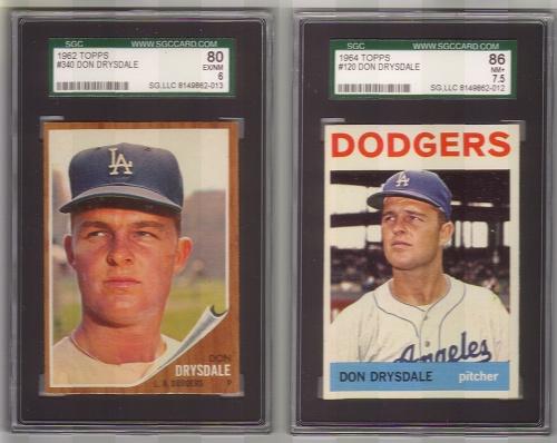 PAIR OF DON DRYSDALE BASEBALL CARDS. Consists of one 1962 Topps baseball card. #340. Graded by SGC. 80. EX/NM 6. 8149862-013. Also consists of one 1964 Topps baseball card. #120. Graded by SGC. 86. NM+ 7.5. 8149862-012.