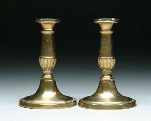 PAIR OF EARLY OVAL BASE BRASS CANDLESTICKS. Heavy casting with tapered column having bottom ribbing. SIZE: 6-1/4in. h. CONDITION: Very good. 9-26037