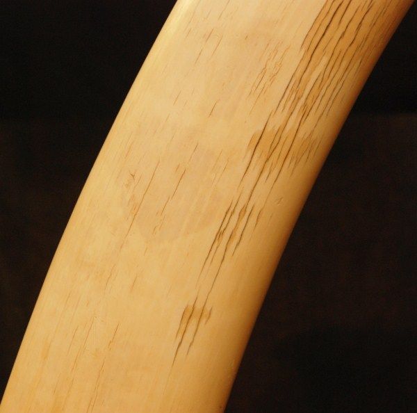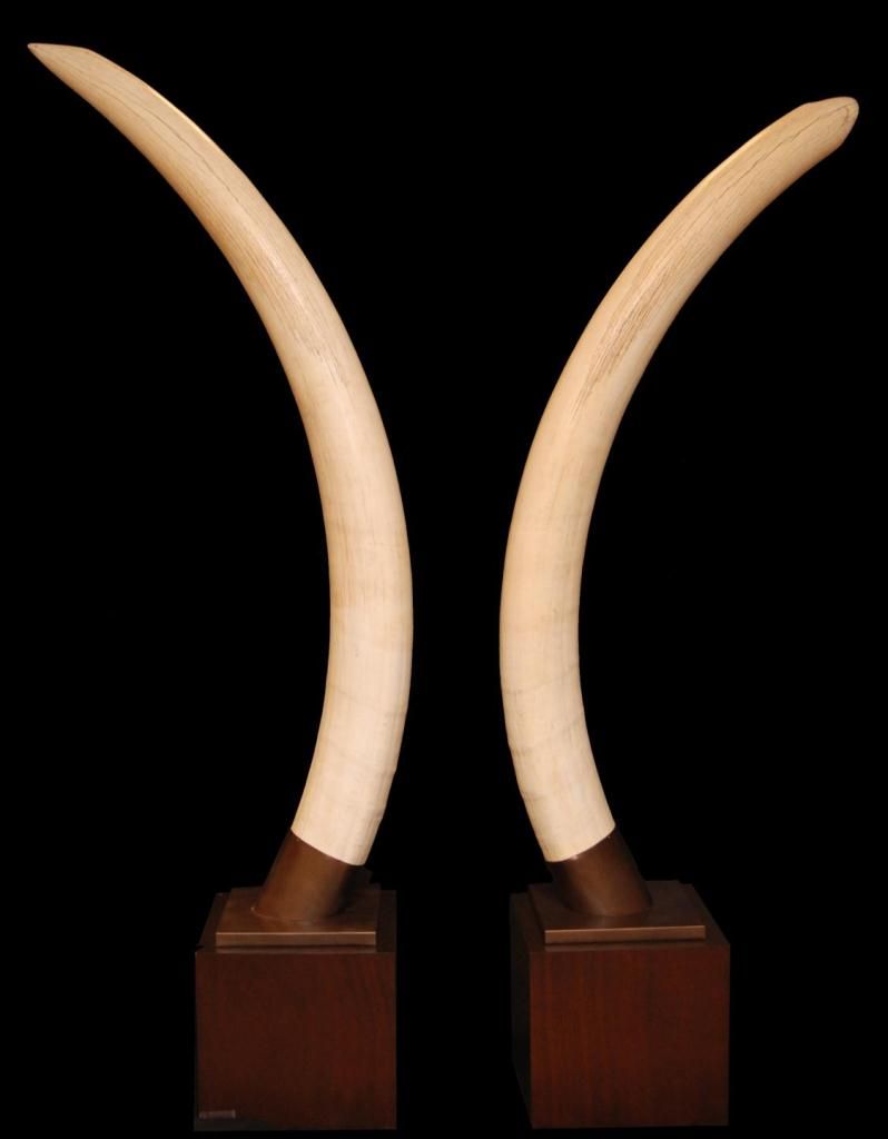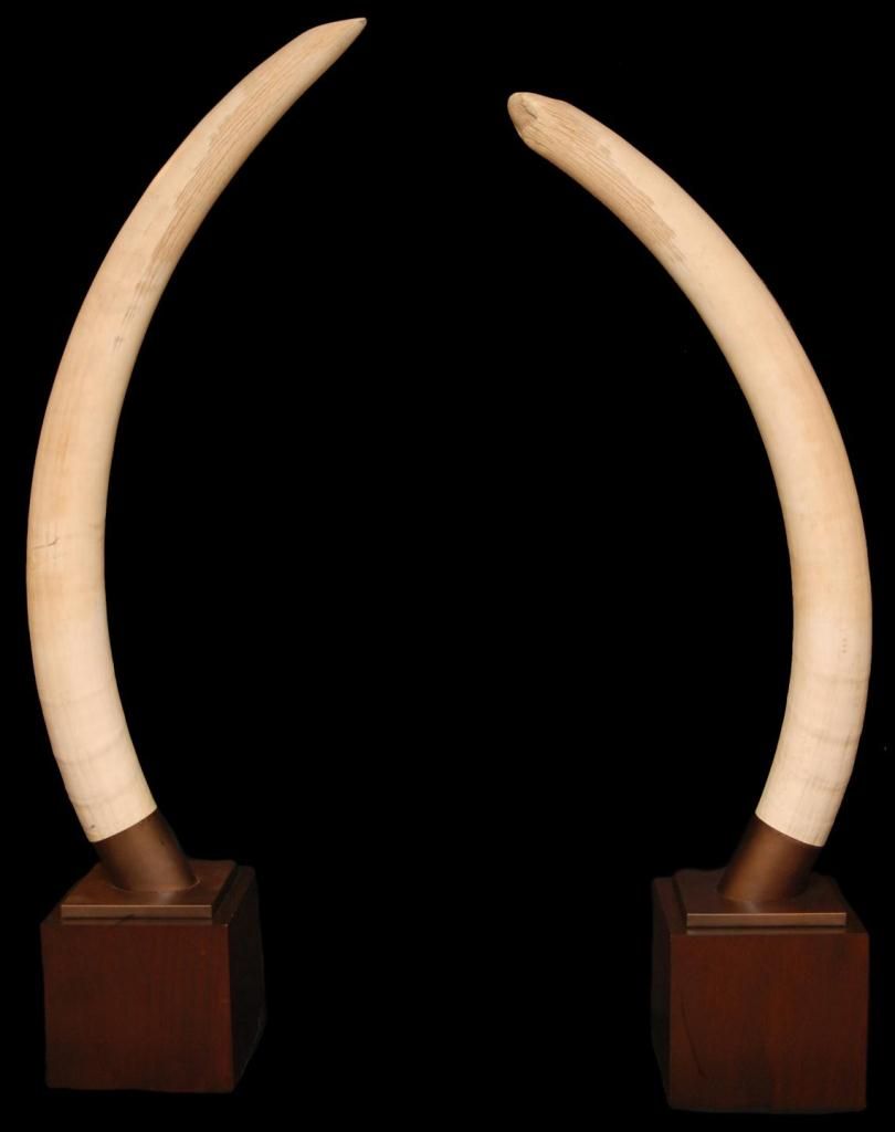 Pair of impressive and very large Elephant Ivory Tusks. One being 81 3/4" length x 21" girth (207.6cm). The next 75" x 20 3/4 (190.5cm x 52.7cm). Actual height of 66" & 60 1/2" height + 15" base height (167.6cm & 153.6cm + 38.1cm). Just under 100 pounds each.