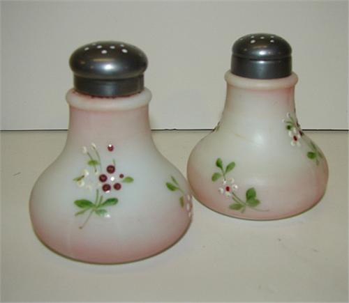 PAIR OF ENAMELED GLASS SALT & PEPPER SHAKERS. Floral decorated. 2.5” H