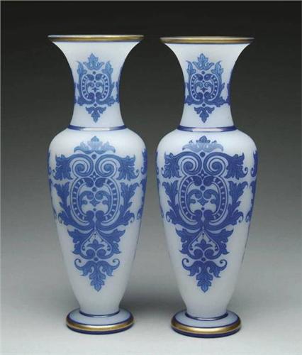 PAIR OF ENGLISH CAMEO GLASS VASES. Probably Stevens & Williams. This matched pair with strong blue overlay on a snow white background having gilt trim highlight at lip, base and constrictions. A matched pair with beautiful intricate design. SIZE: 11-3/4" t. CONDITION: Overall very good to excellent. 5-62215