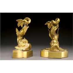PAIR OF ENGLISH GILT BRONZE DOORSTOPS,, modelled in the form of dolphins on breakfront bowed pl...
