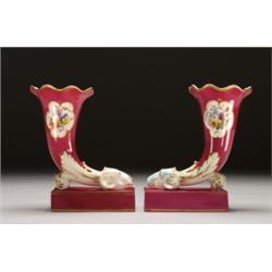 PORCELAIN SPILL VASES, moulded as cornucopia with ram's head terminals on plinth bases, painted with gilt-bordered panels of colourful garden flower sprays on claret grounds, minor condition noted, ht. 7.2" -