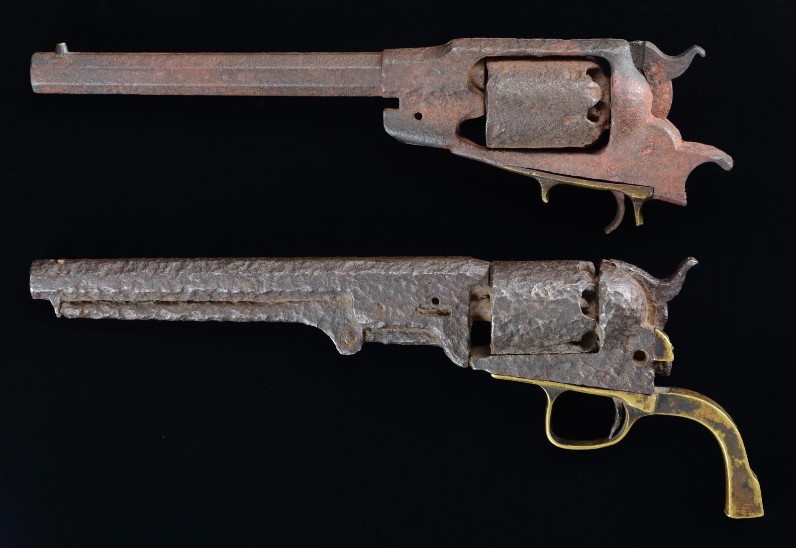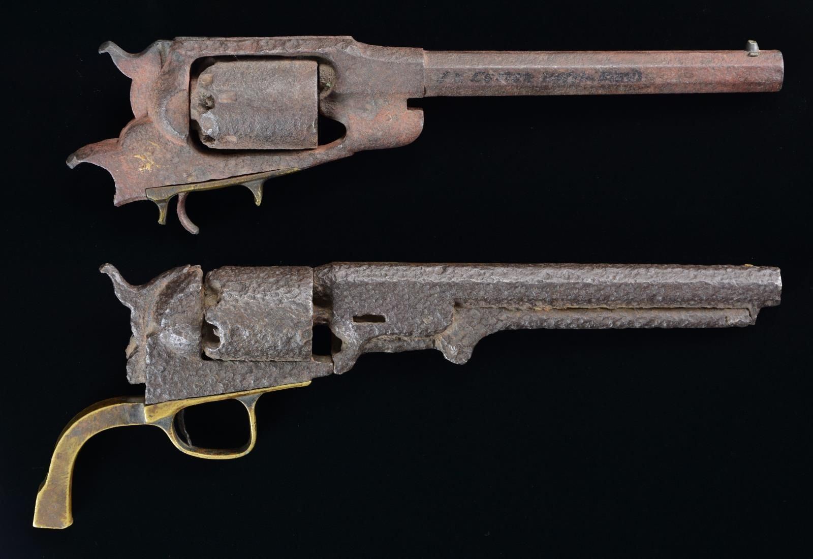 Colt M-1851 Navy, S# 142838 made in 1863, lacking backstrap but otherwise complete. Remington New Model Navy revolver lacks loading assembly, grip frame, and trigger bow, no discernible markings. No information as to where collected, but relic guns all have a story. CONDITION: good for dug up relics, heavy iron patina and deep pitting, both revolvers frozen, though hammer moves on Remington. PROVENANCE: Martin Lane Historic & Western Americana Lifetime Collection. (02-21410/JS). $800-1,200.