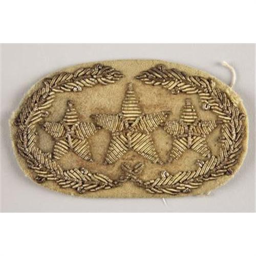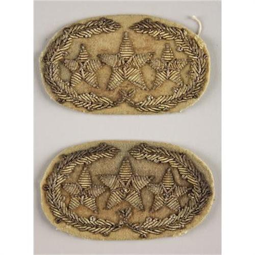 <B>PAIR OF EXTREMELY RARE CONFEDERATE GENERAL GOLD BRAID COLLAR INSIGNIA.</B></I> A 1 by 3¼” oval design. The outer wreath has 3 five-pointed starts enclosed. The central star is larger than the outer stars. The background is a light wool broadcloth on a pasteboard backing. These insignia were acquired at the same time a Georgia tailor’s archive came on the market that contained the original pattern for General Howell Cobb’s Confederate uniform. These insignia are possibly from that archive. This is a rare opportunity for a museum or advanced collector to obtain these insignia.<BR><BR><B>Provenance: </B></I><I>Steve Mullinax, Author of Confederate Belt Buckles and Plates<BR>William Turner, Author of Confederate Faces<BR><BR>Letters of Authenticity from William Turner and Les Jensen accompany this lot.</B></I><BR><BR><b>Shipping:</b> Miscellaneous Collectibles, Smal (<a target="_blank" href="http://www.heritageauctions.com/common/shipping.php">view shipping information</a>)