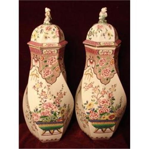 Samson has become very collectible and as of late has been difficult to find real nice pieces. In the past we have had plates with armorial family crests but vases and bowls and tureens have not existed or are just not available. This a Fabulous Pair of Samson Chinese Export Covered Vases in the Famille Rose Pattern measuring 21 1/2" in height. They are absolutely Fantastic and would look absolutely Fantastic on a Sideboard in the dining room and are at a very reasonable price. Fresh out of a Southern Estate in Perfect Condition with No Restoration. Thet not only have the original covers but they have a very unusual Hexagonal Swirl Form, in the famille rose palette. The diameter of the vases are 8". Wonderful Foo Dog Finials on the covers. The bases bear the painter's marks in underglaze red, "772" and "800". Virtuallt in Mint Condition. Clear Transluscent White Body with Brilliant Gilding and Painting. Additional Images are available upon request.
