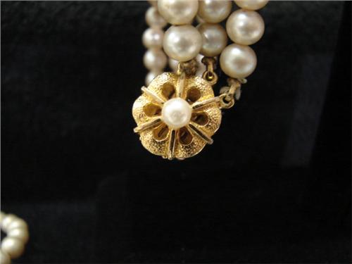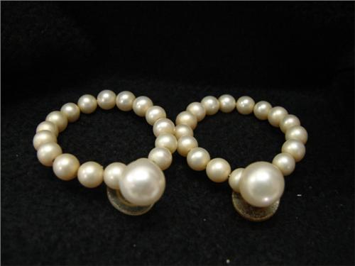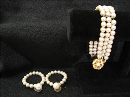 PAIR OF FAUX PEARL EARRINGS & BRACELET. Consists of a pair of faux pearl stud earrings with 17 faux pearl detachable enhancers. Also consists of a triple strand faux pearl bracelet.