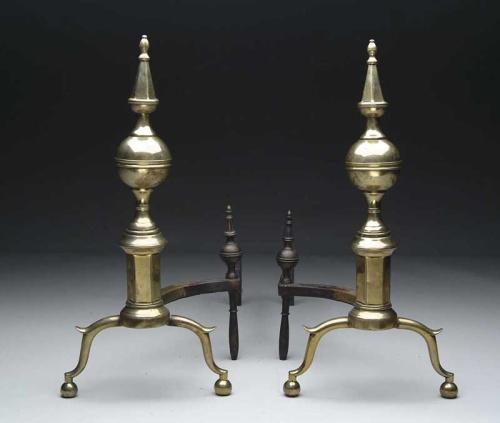 PAIR OF FEDERAL BRASS FACETED STEEPLE ANDIRONS. Matching log stops. Ball and spire form andirons resting on two spurred legs. SIZE: 20-1/2” h x 22-1/2” l. CONDITION: Very good. 9-27934