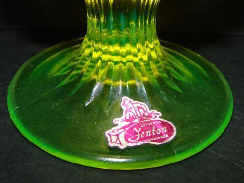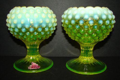 PAIR OF FENTON OPALESCENT VASELINE GLASS STEMMED ROSE BOWLS. Hobnailed pattern. One rose bowl retains Fenton sticker at base. 4.5” H