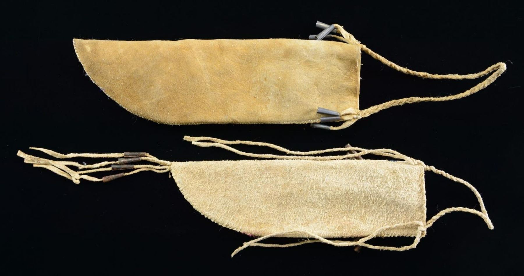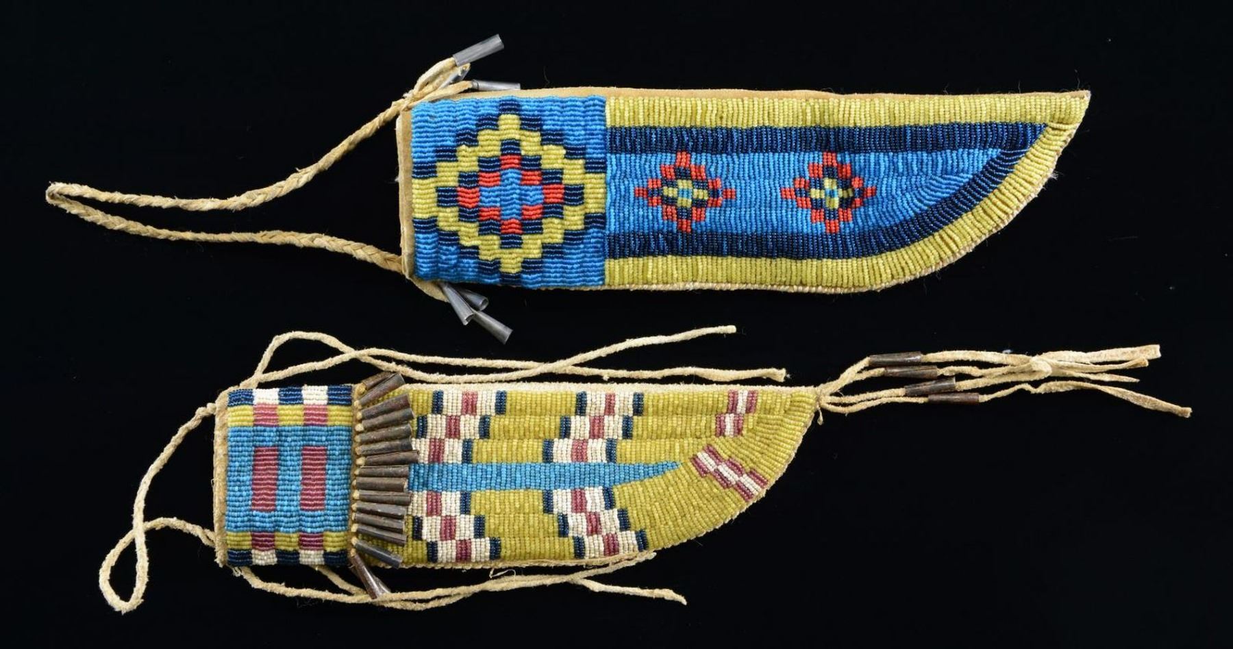 SHEATHS. 10” x 3” & 11” x 3.25” sinew & thread sewn, full coverage beading in yellow, blue, red & white, one with row of tinkle cones. CONDITION: fine overall. (02-20991, 20994/JS). $500-600.