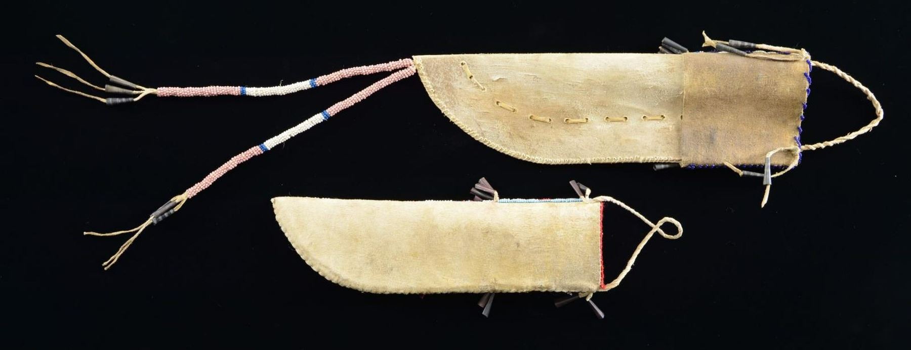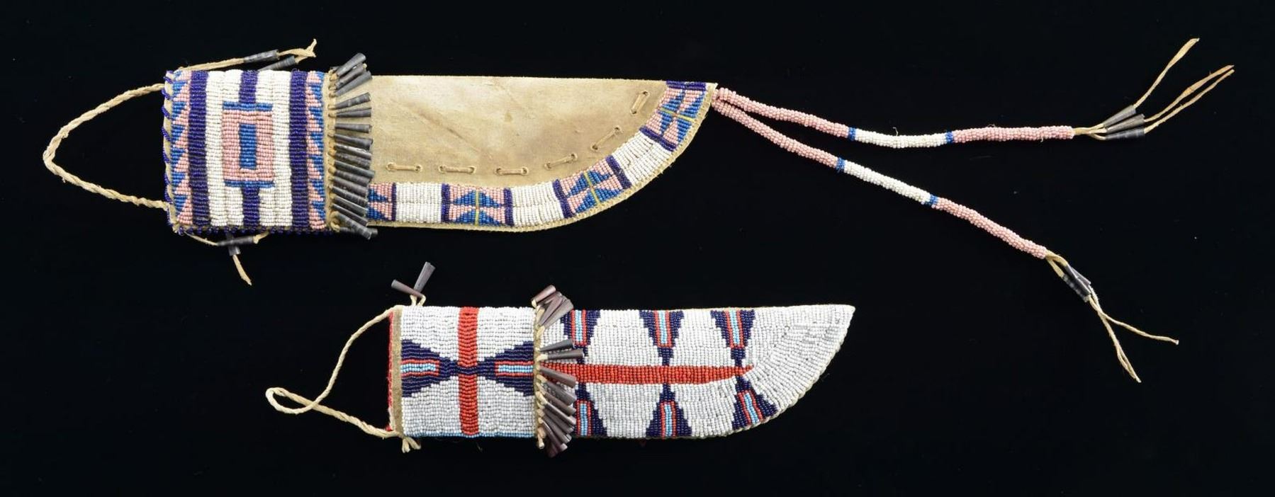 SHEATHS. 10” x 3” & 12” x 3.5” sinew & thread sewn, full coverage beading on one with white ground, red, & blue. The other beaded on edge and top in pink, blue, red, yellow & green, 2 long beaded extensions at tip, each with row of tinkle cones. CONDITION: fine overall. (02-20992, 20993/JS). $500-600.