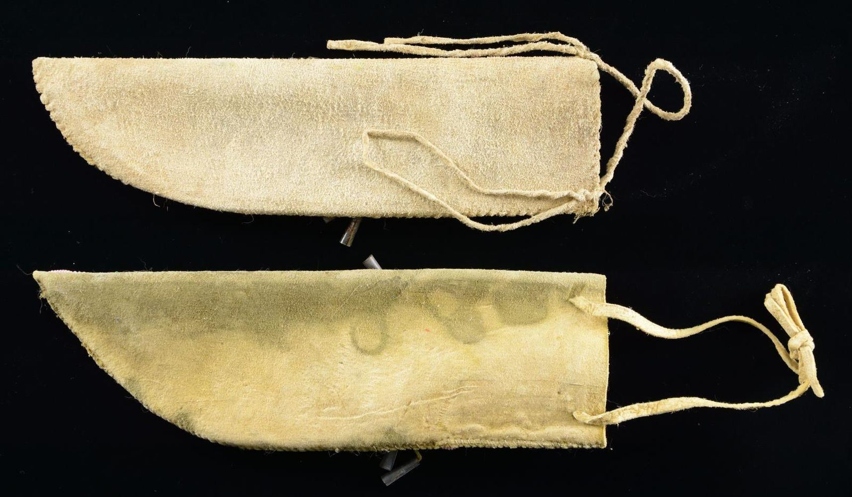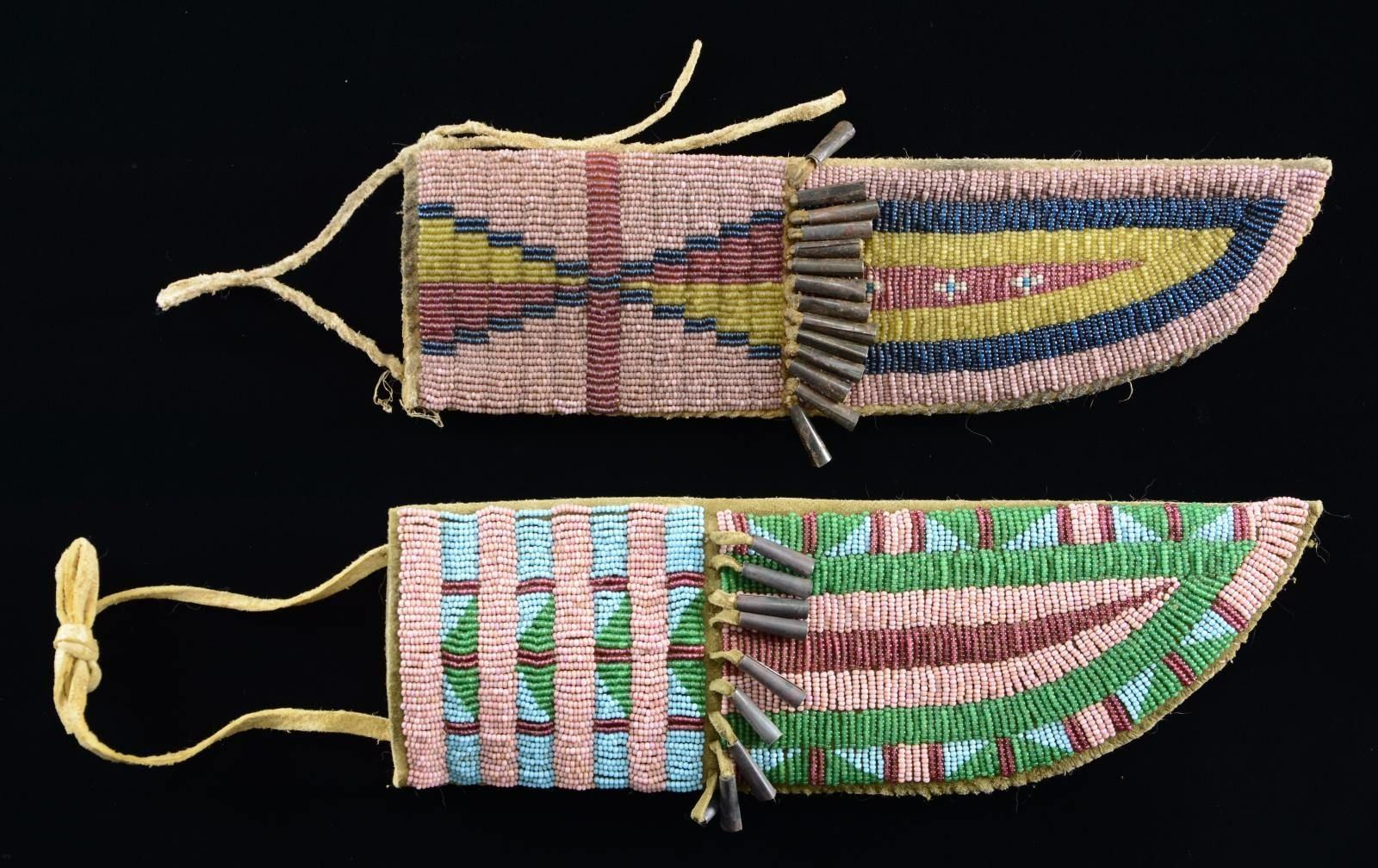 SHEATHS. 10” x 3” & 10.5” x 3.25” sinew & thread sewn, full coverage beading in pink, blue, red & green, each with row of tinkle cones. CONDITION: fine overall. (02-20995, 20996/JS). $500-600.