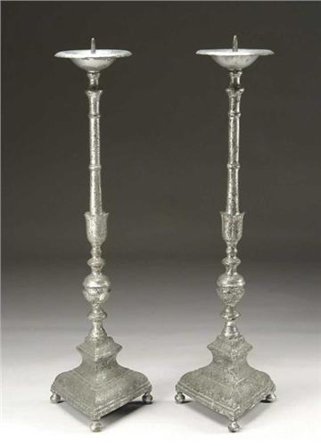PAIR OF FLOOR STANDING BRASS PRICKET CANDLE HOLDERS. Solid brass candlesticks with a silver finish. Triangular footed bases with a decorative turned post, large pricket and drip pan. SIZE: 43-1/2” h. CONDITION: Very good. 9-26860