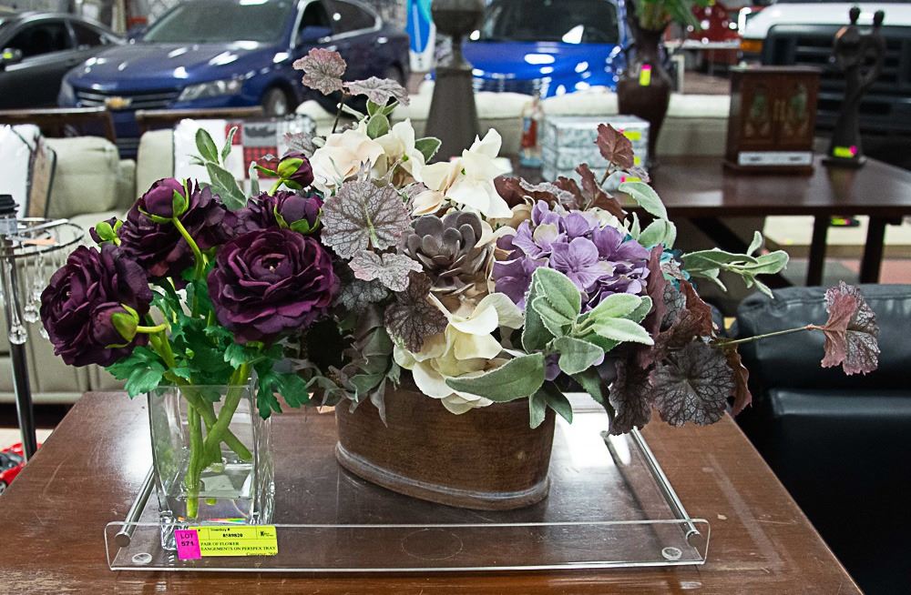 PAIR OF FLOWER ARRANGEMENTS ON PERSPEX TRAY