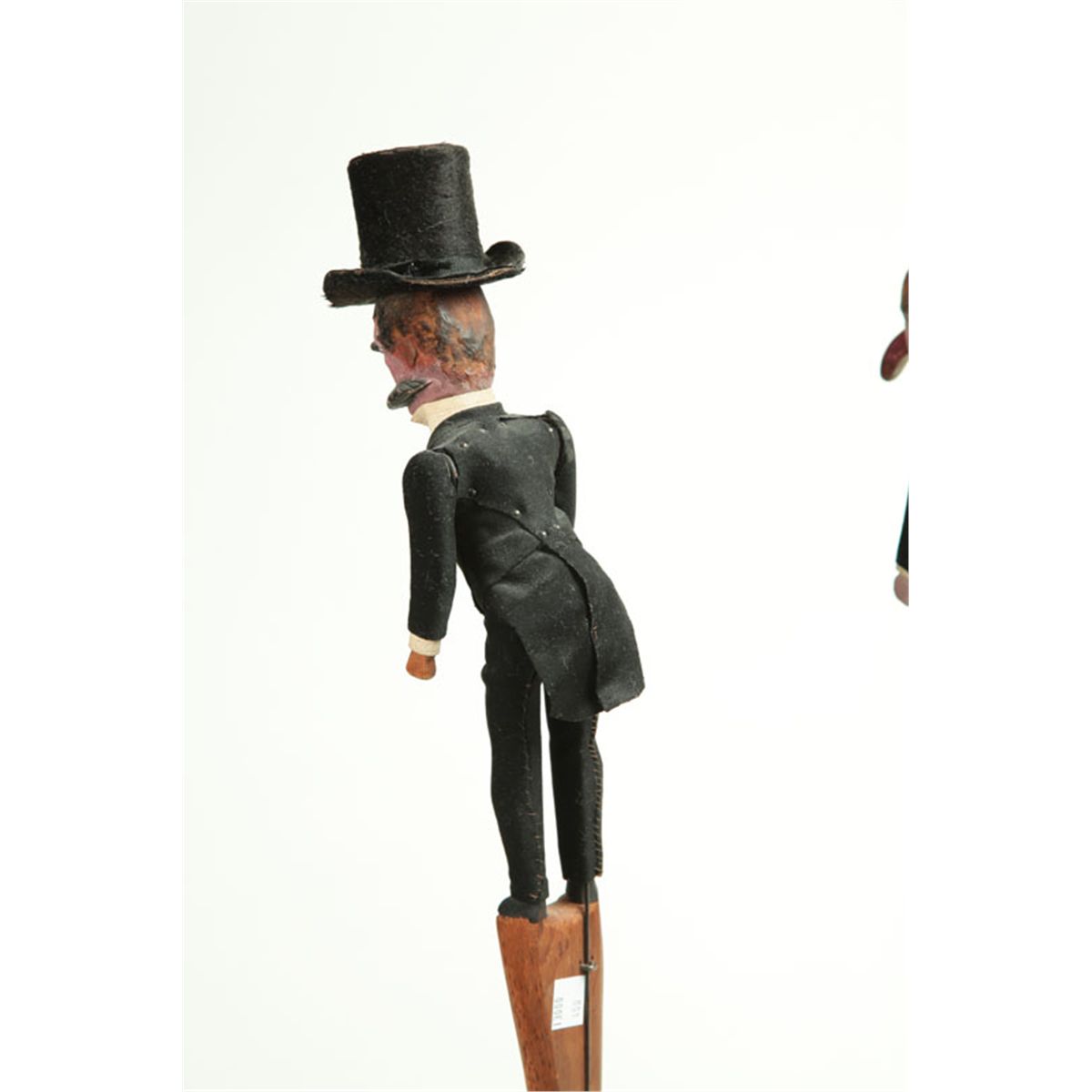 Tennessee, late 19th century, pine and fabric. Two gentleman, one with a big mustache, the other wearing a top hat, both are articulated, including one of the noses. Purportedly used by a photographer to get the attention of children. Original paint and clothing. 22" and 24"h. Ex Monty Young (Tennessee).