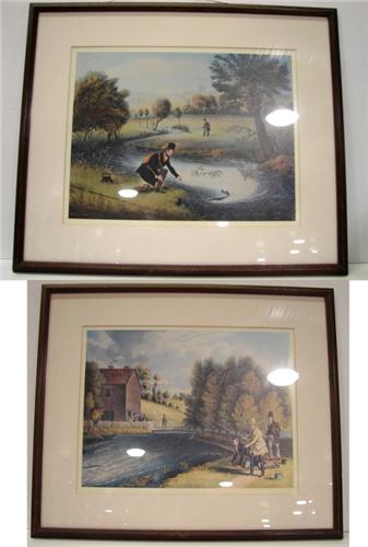 PAIR OF FRAMED FISHING PRINTS. One print depicts a gentleman fishing in a stream. The other print depicts a group of gentleman fishing in a stream. 30” x 25” framed.