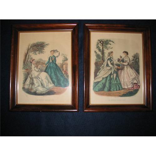 HERE IS A BEAUTIFUL SET OF FRENCH COLORED LITHOGRAPHS FROM LA MODE ILLUSTREE IN GORGEOUS ANTIQUE VICTORIAN WALNUT FRAMES. LA MODE ILLUSTREE WAS A LEADING FASHION MAGAZINE IN FRANCE IN THE 1800'S. THESE HAND COLORED PRINTS WERE INSERTED IN THE MAGAZINES WHICH CONTAINED A DESCRIPTION OF THE FASHIONS THEY WERE ILLUSTRATING. THEY ARE BOTH ARTIST SIGNED AND IN VERY GOOD CONDITION INCLUDING THE FRAMES.