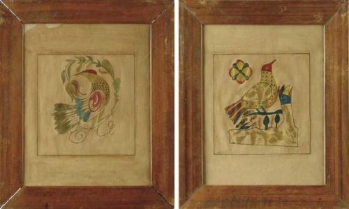 PAIR OF FRAMED WATERCOLOR FRAKTURS BY BOB BISCHOFF. The Pennsylvania type watercolors are done in bright colors in fraktur type style. One has bird on branch, the other has bird with design in sky. One has back signed “Bob Bischoff 1941”. Identically housed in grain painted wood frames. IMAGE SIZE: 8-3/4” x 8-1/4”. CONDITION: One has section missing from edges and tears through border. 9-27619