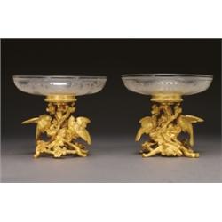 PAIR OF FRENCH GILT BRONZE AND ETCHED GLASS COMPORTS, each, shallow circular bowl etched with p...
