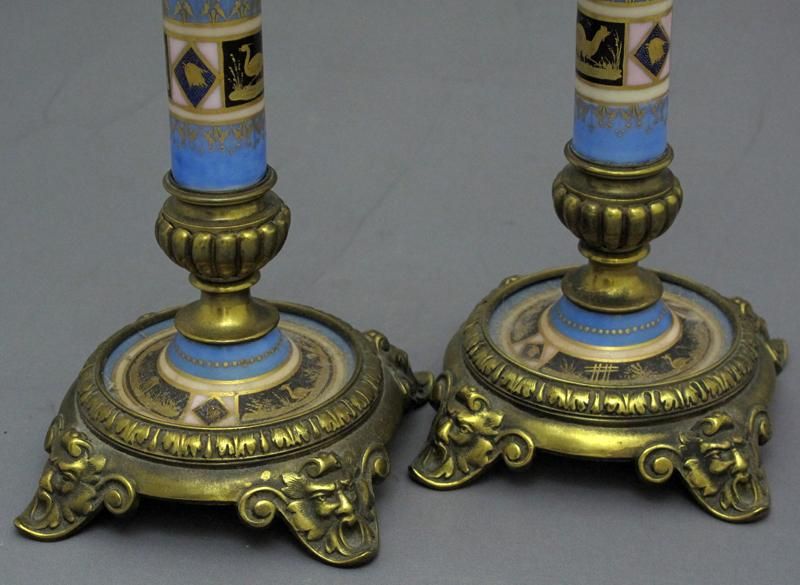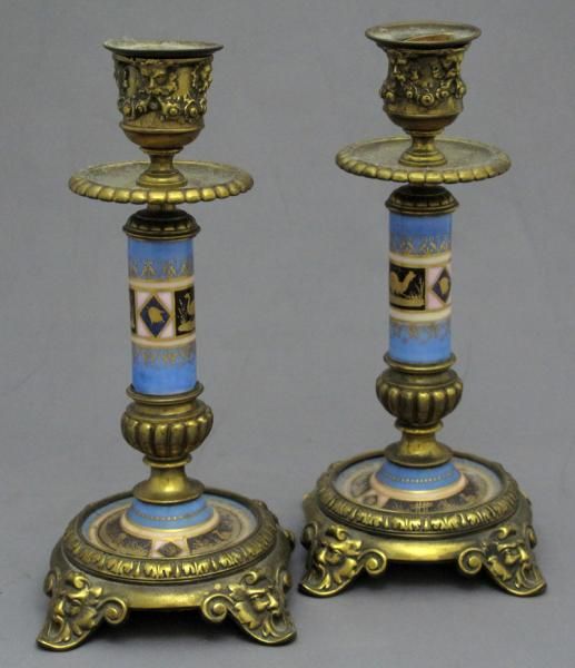 -19th century, painted porcelain single light candlesticks, complete with original firm fitting drip pans.