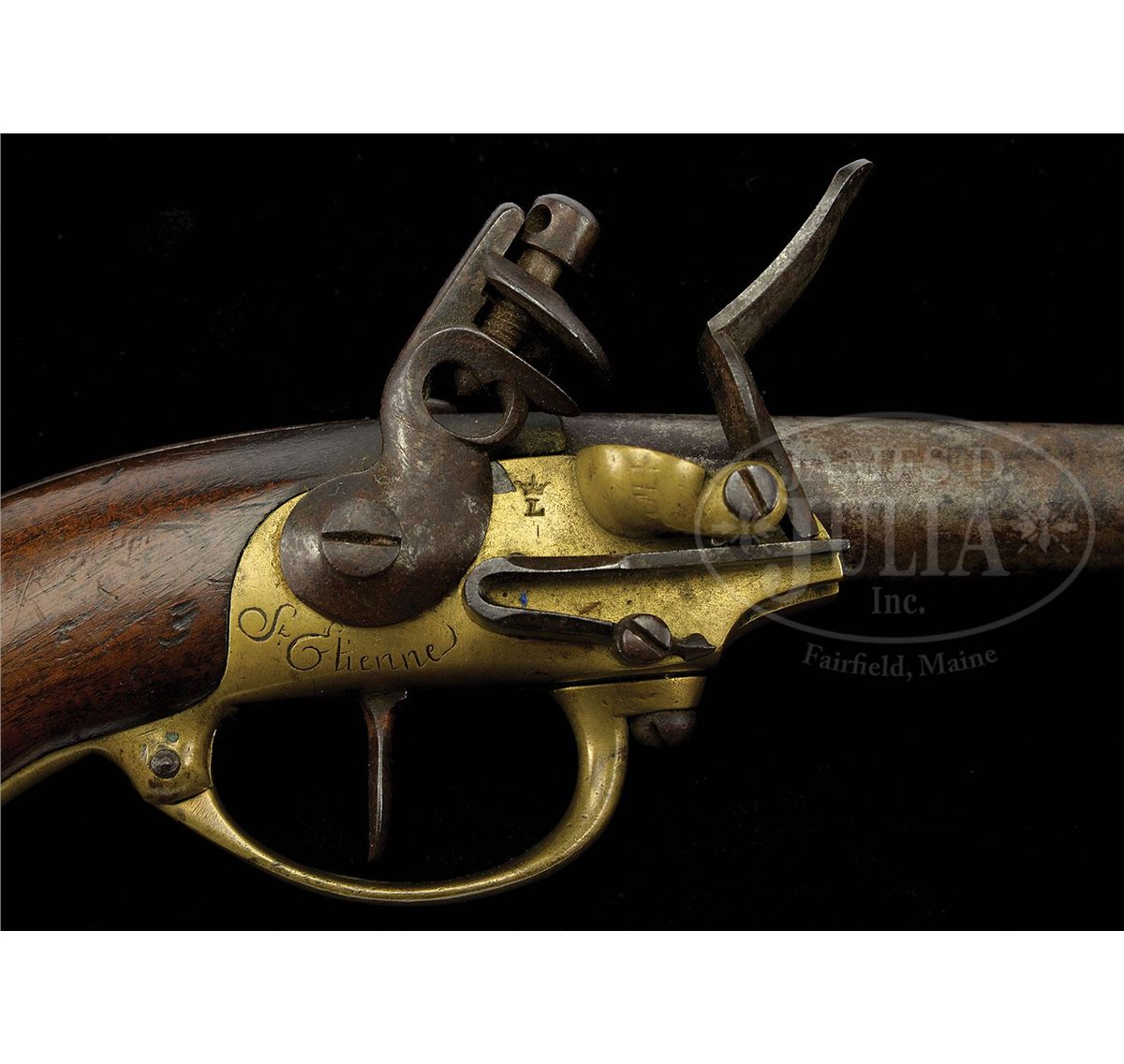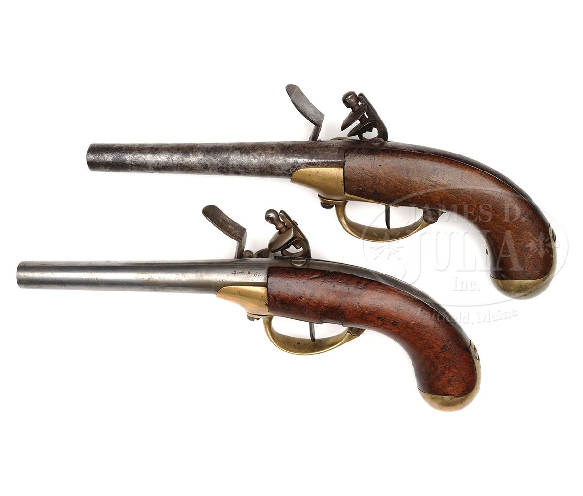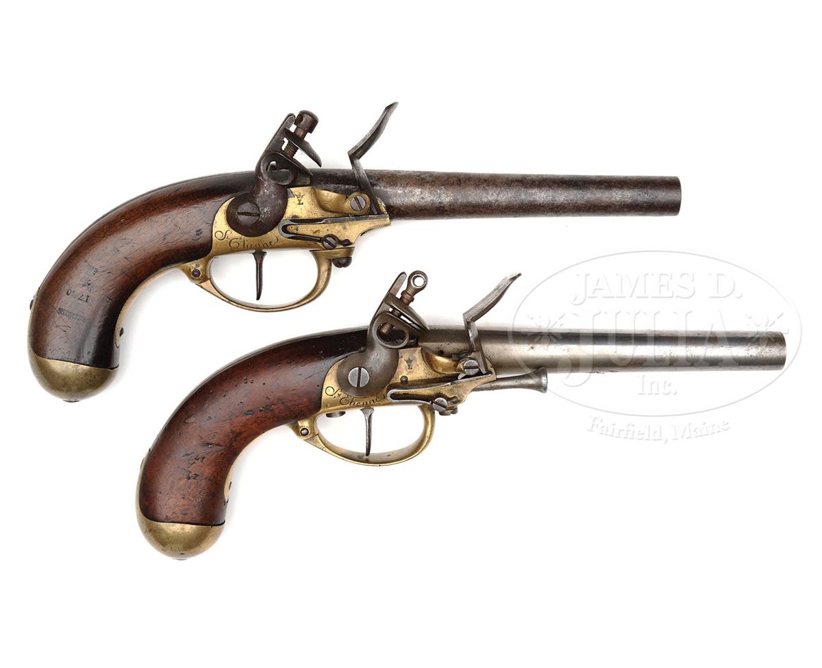 NSN. .70 Cal. x 7-1/2" long bbl marked "79" (1779) with the French Proof Mark on both pistols. Pistol #1 has ramrod, pistol #2 lacks ramrod. Locks are marked behind the pan Crown / "L" and underneath the cock "St. Etienne" in script. Neither pistol carries a belt hook and only pistol #1 has a screw under trigger guard where belt hook would have been attached. Frame, tigger guard, and buttcap are made of brass. European walnut stocks are marked on pistol #1 with "177_" Crown is scuffed out but the letter "B" is present. Pistol #2 is clearly marked "1780" / fleur-de-lis / "B". CONDITION: Pistol #1 Bbl is shiny from polish, with minor pitting around touch hole area and frizzen, cock is a modern replacement and looks correct but could be made to look much better. Ramrod is old, fits well, and may be orig. Front trigger guard screw has been replaced. Buttcap is in very good condition with only a small number of nicks from handling. Stock is in very good condition with some nicks, dings, and worm holes, right side of butt has been scuffed where fleur-de-lis once was. Pistol #2 Bbl is developing a brown patina with light to medium pitting around touch hole and associated lock areas, top jaw and screw are replaced, brass frame is in very good condition with approximately 20 small nicks behind trigger guard, buttcap is in very good condition with only a small number of nicks from handling. Walnut stock is in very good condition and fits well to metal with no major losses. 4-49391 PAS81