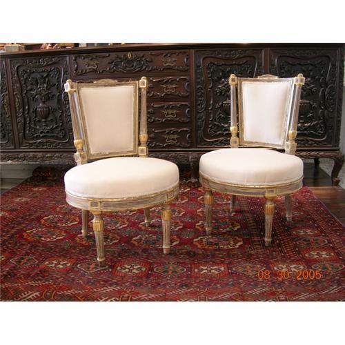 EXQUISITIVE PAIR OF PAINTED AND GILTED FRENCH NAPOLEON III CHAIRS, UPHOLSTERED IN LIGHT BEIGE SILK. THEIR LOW SEATS, HEIGHT 15.2", INDICATE THEY WERE ORIGINALLY MANUFACTURED TO BE USED BY THE FIREPLACE. LATE 1800'.