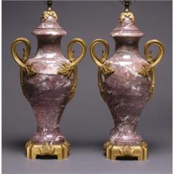 PAIR OF FRENCH ORMOLU MOUNTED PURPLE MARBLE TABLE LAMPS, of ovoid shape with bifurcated foliate h...