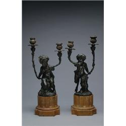 PAIR OF FRENCH PATINATED BRONZE AND MARBLE TWO-LIGHT CANDELABRA, modelled as a standing faun or seated putto issuing scrolling foliate branches on fluted half column pedestals and plinth bases, ht. 16.9" - 43 cm., 19th century