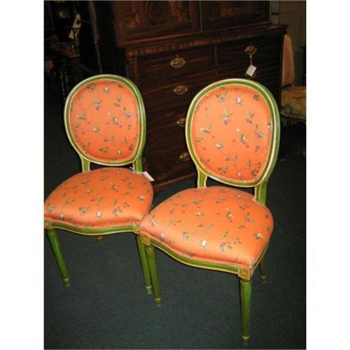 VERY STRIKING PAIR OF LOUIS FRENCH SIDE CHAIRS IN PAINTED GREEN AND CREAM FRAMES . THE PAINT WORK IS CERTAINLY OLD IF NOT ORIGINAL TO THE CHAIRS AND IN GOOD CONDITION. THE CHAIRS HAVE BEEN RECENTLY UPHOLSTERED IN A BEAUTIFUL ORANGE FABRIC WITH CHERRIES AND GREEN LEAVES. THE BACKS OF THE CHAIRS HAVE BEEN DONE IN A MATCHING GREEN CHECK. THE CHAIRS WERE MADE CA 1880 AND WILL MAKE A FABULOUS ADDITION TO ANY ROOM - THEY ARE QUITE STUNNING!