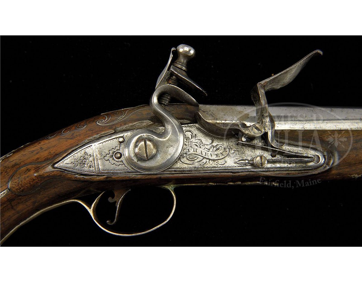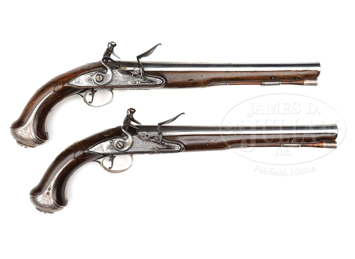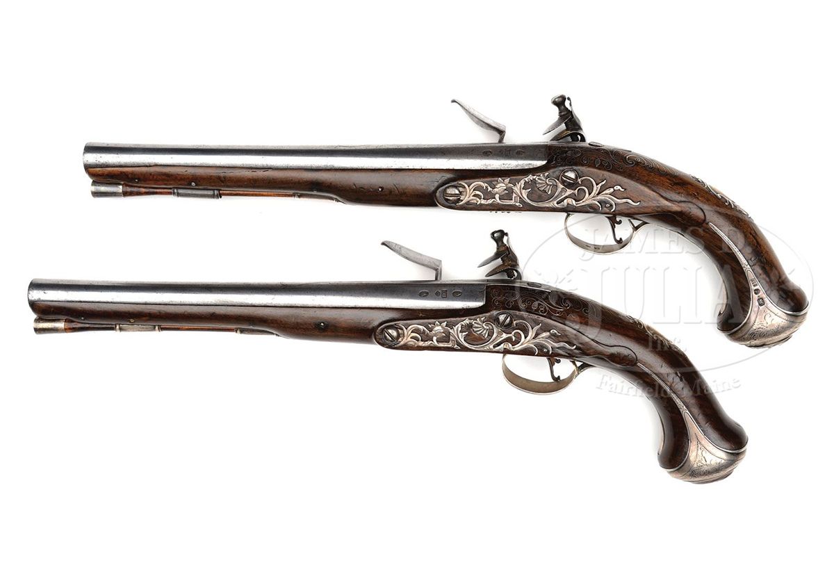 NSN. Stockel lists John Harvey with working dates 1797-1830 however we believe this is an error as these pistols are earlier. The bolted lockplate signed "J Harvey" is engraved in typical English fashion. Plain hammers, frizzens with line engraving, bbls rnd with full proofs and "IH" sunken in a poincon. The finely figured walnut full stocks are inlaid with silver wire in a shell pattern behind tang. The elaborately cast and chased sideplates are open work. Spurred buttcaps are engraved with pommels with a large grotesque face. Silver mounts are by the famous silversmith Charles Freeth. Silver tipped ramrods are the orig. Steel triggers are nicely articulated. Showy and attractive pair of full silver mounted English flintlock pistols. CONDITION: Condition of silver mounts is generally very good however there have been repairs to silver on trigger guard of both pistols. Stock on one pistol has sliver missing on left side and minor splintering. Stock on other pistol is good throughout. The cocks are not engraved and may possibly be period replacements however they are perfect in both form and function. Steel parts are heavily cleaned with some loss of definition at engraving at breeches. 4-49390