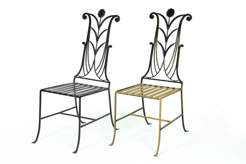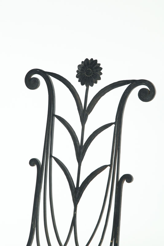 Twentieth century, wrought iron. Good folksy detail with stylized flowers and foliage on backs. 41"h.