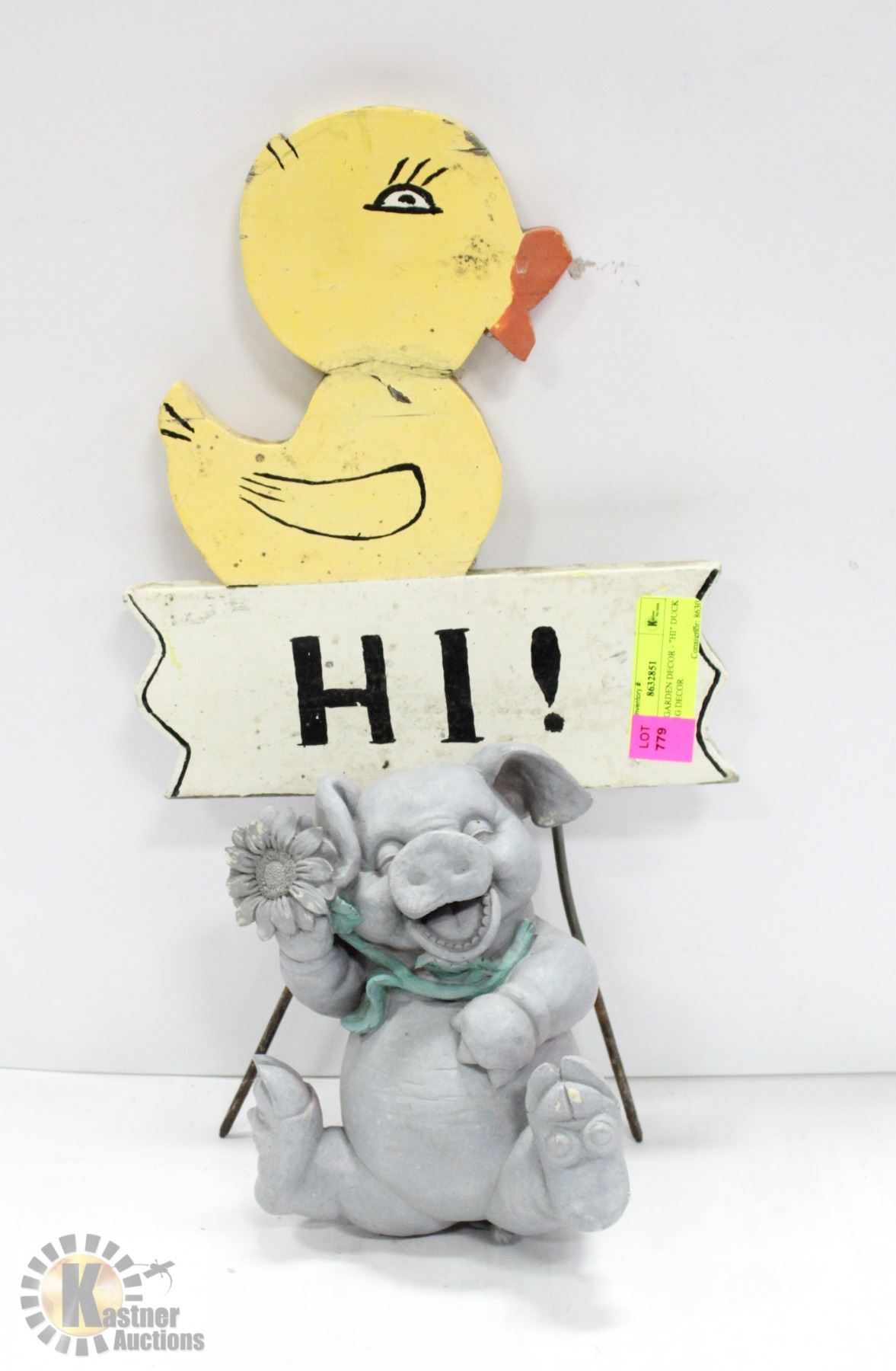 PAIR OF GARDEN DECOR - "HI" DUCK SIGN + PIG DECOR