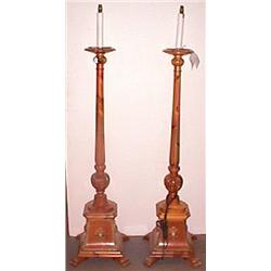 PAIR OF GEORGIAN STYLE CARVED AND WAXED PINE TORCHERES, 20th century, having circular beveled edge tops, the standards of tapering reeded design set on shaped rectangular bases with shell motifs, all set on paw feet; 72 inch overall height
