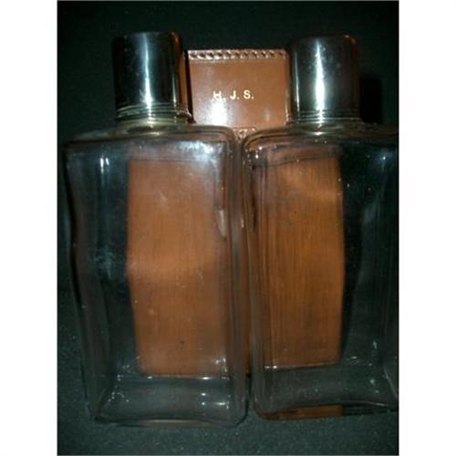 LEATHER BOX MARKED H.J.S AND A PAIR OF GLASS DECANTERS W/SILVER LID MARKED GERMANY EARLY 20th 8"X3" CONDITION SOMME TEAR TO TOP OF LEATHER LID