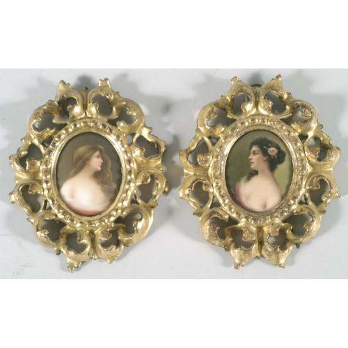 PAIR OF GERMAN PORCELAIN PLAQUES, 2 1/4"x1 3/4", hand painted with portraits, CONDITION REPORT: some loss to frames, porcelain excellent, PACKING AND SHIPPING: Fairfield Auction will provide packing and shipping (excluding insurance) within the Continental U.S. for $20. Buyer is welcome to use any other service or pick-up at the gallery.