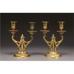 PAIR OF GILT BRASS, CANDELABRA, each with, flaming torch support issuing foliate scroll branc...
