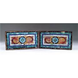 Lot 546 PAIR OF GLASS MOSAIC TILES Very interesting glass mosaic tiles consist of four borders of various colored glass surrounding a center panel of geometric and floral mosaic design. Tiles are encased in a metal rim with felt bottom. Possibly made my Bigelow & Kennard. SIZE: Each tile is 11” x 6”. CONDITION: One tile is missing approx. three glass squares on outer border, otherwise very good. 5-70960