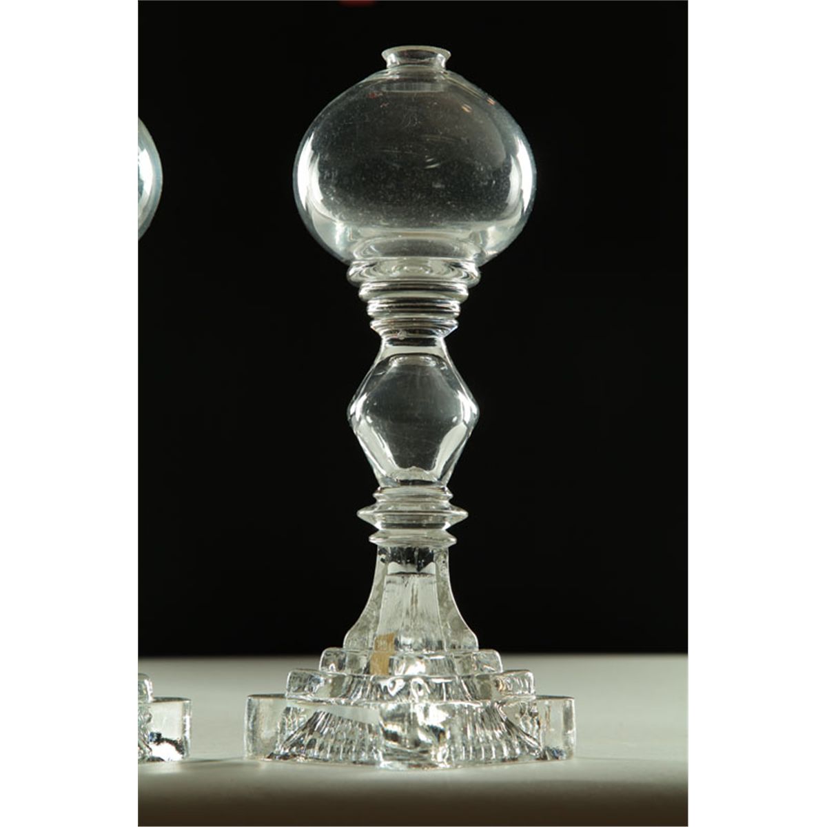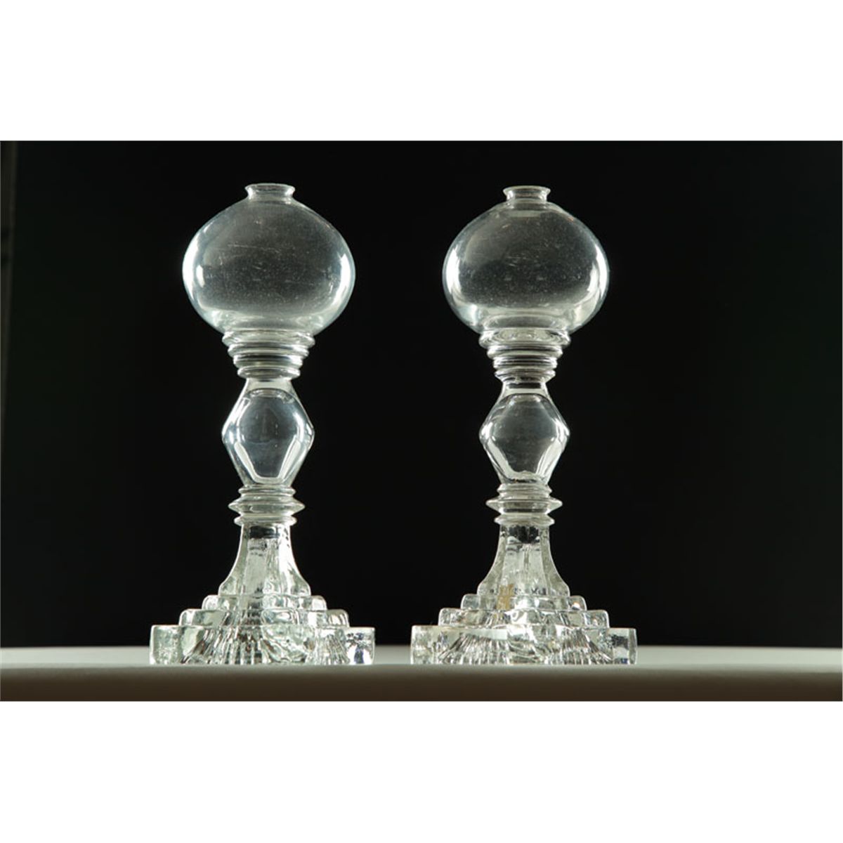 Probably New England, 2nd quarter-19th century. Colorless, blown fonts, pressed stems with diamond bases. 10 1/2"h. Ex Allan Hodges (Ohio).