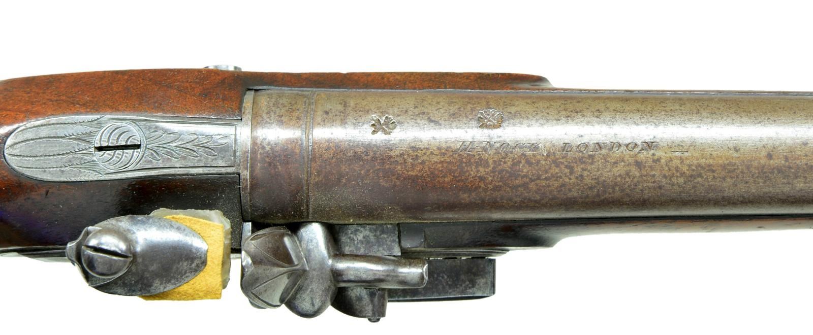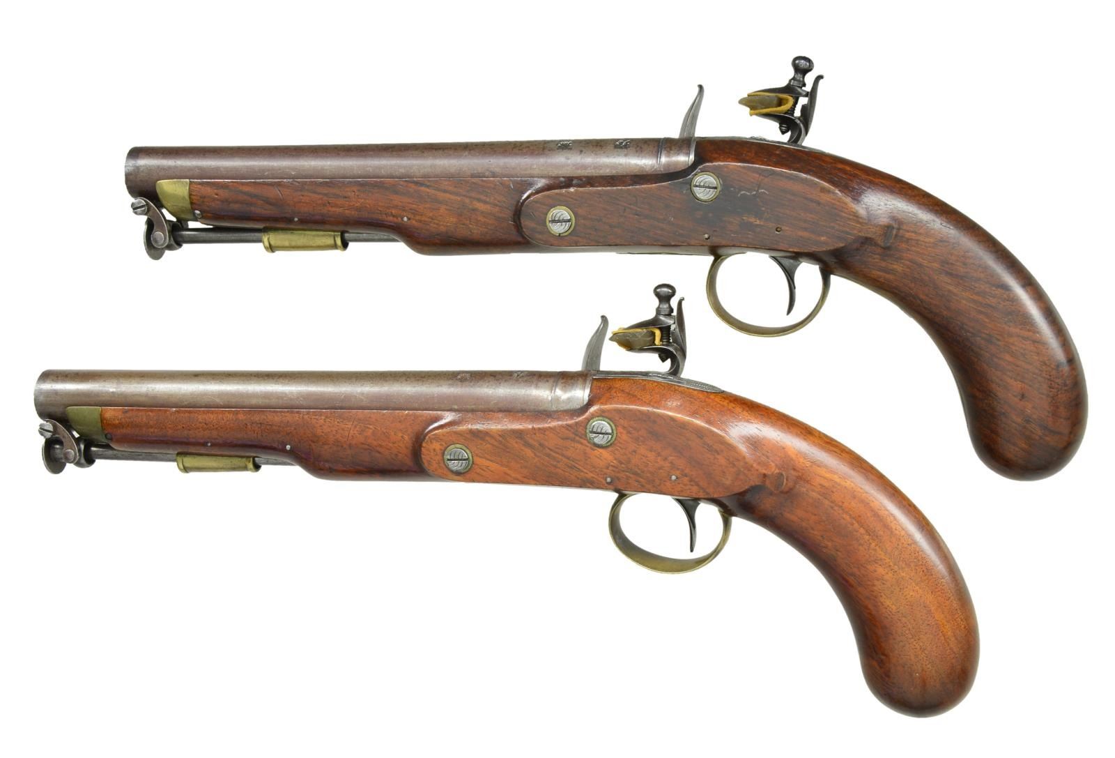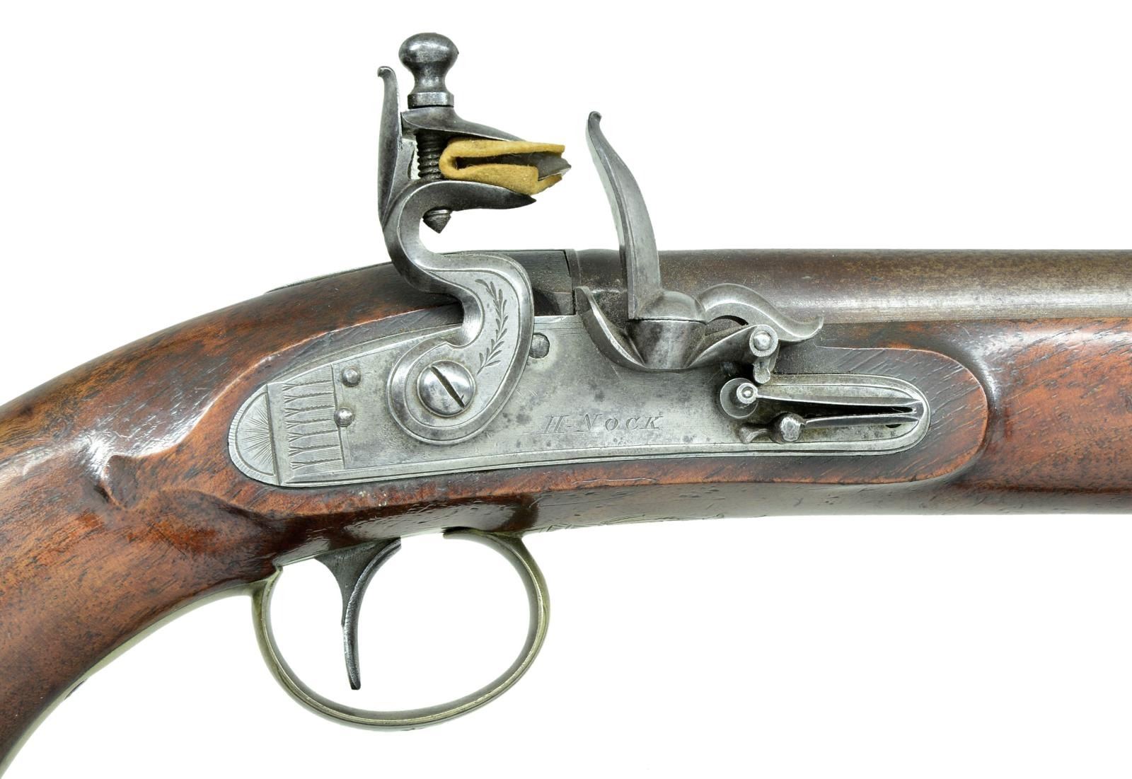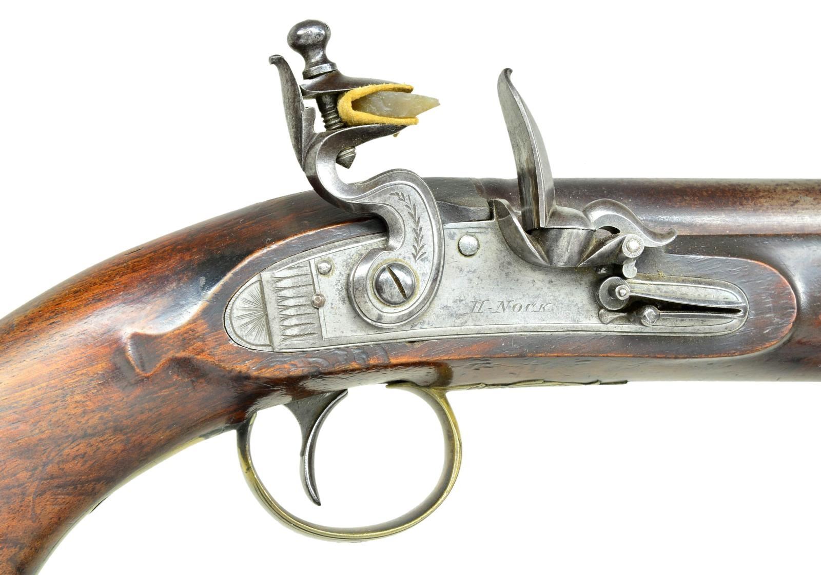 MARKED H. NOCK. BOTH: Cal. 65. NSN. The 9" iron bbls. w/ military type turnings at breech ends are stamped w/ Birmingham proofs & engraved "H. Nock London" on tops. Bbls. are fitted w/ bridles for steel ramrods. Locks w/ bevelled plates & rebated tails are fitted w/ high breasted serpentine cocks, water proof integral pans, bridled roller frizzens w/ roller on feather springs which have bulbous finials. Locks are engraved w/ line borders & some sprays of foliage. "H. Nock" is in front of each cock. Plain European walnut stocks w/ bag grips extend to within 5/8" of muzzles w/ brass caps & are brass mounted. Trigger guards w/ traditional pineapple finials have floral & foliate engraving on bows. Bbls. are pinned to stocks & steel ramrods mount through heavy beaded single pipes. Thimbles are not peesent. CONDITION: very good to fine. Bbls. retaining what appears to be traces of original brown, showing some cleaning & some overall spotting. Locks retain a considerable amount of original case hardening color which is heavily faded & are mostly silver gray. Stocks retain most of their original oil finish w/ some minor marks, knocks & dings, & appear very sound w/ possible old repair on sideplate of one pistol. Bores are lightly pitted. One lock is crisp, the other is slightly soft. A good pair of nock knockoffs. (01-21215, 01-21216/MGM). BOTH ANTIQUE. $5,000-7,000.