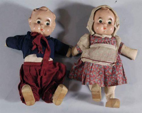 PAIR OF GOOGLEY EYE COMPOSITION DOLLS with cloth bodies and wooden Dutch shoes, 15" long, circa 1930, CONDITION: excellent, no damage or repairs. PACKING AND SHIPPING BY FAIRFIELD AUCTION WITHIN CONTINENTAL USA (excluding insurance) $25,