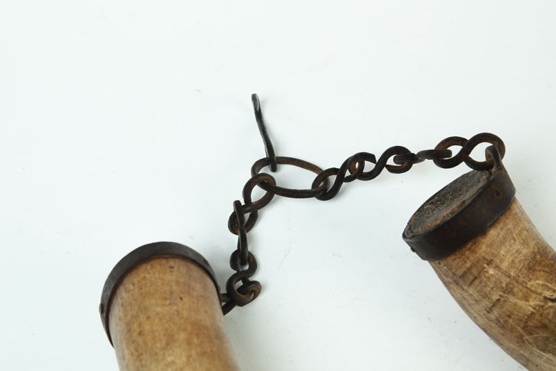 American, 19th century. Two horns with incised compass stars, combined by a chain, 12 1/2"l., a horn spoon, and powder flask, 7"l.