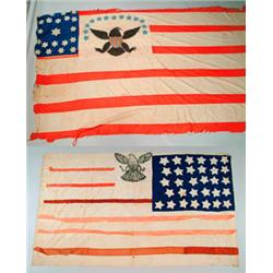 PAIR OF GREAT FOLKY HAND-MADE PATRIOTIC FLAGS FROM THE ESTATE OF A 20TH MAINE REGIMENT CORPORAL. These flags are fresh out of an estate in central Maine. The estate included Civil War memorabilia and artifacts belonging to Cpl. John William Morin of Embden, Maine who was a member of F Company of the famous 20th Maine regiment commanded by Col. Joshua Chamberlain. Morin served with the 20th in 1862 and 1863, including the battle for Little Round Top at Gettysburg. At the end of 1863, he was transferred to the Signal Corps. The house in which these flags were kept was unoccupied for years, and someone broke into the house and stole almost all Morin’s Civil War artifacts. Fortunately, these wonderful flags were folded up in a trunk under the eaves and were overlooked by the thief. The smaller flag is approximately 58” x 34”. It is one-sided and is made on a large piece of white cotton. The six red stripes are made of silk dressmaker’s ribbon sewn on to the white backing. This makes 13 stripes in all, but with the unconventional white outer stripes. The blue cotton canton is sewn to the white backing and the 31 stars are cut out to show the backing. Next to the canton is a panel featuring a very folky hand-painted eagle. The 31 stars date this flag to the period of 1851-1858 and the symbology in the eagle supports that. The eagle has an olive branch in its (own) right talon and is facing that direction, as appropriate for a time of peace. Also the canton rests on a white stripe, also appropriate for a time of peace. The larger flag is approximately 152” x 64” and is double sided. The hoist end has been folded over a piece of hemp rope and stitched. There are also several leather tabs attached to its top edge so it could be displayed horizontally. The body of the flag is constructed of strips of red and white cotton sewn together. The flag has only 11 stripes - 6 red and 5 white. The blue cotton canton has 21 6-pointed cotton stars stitched onto either side. There are thirteen 5-pointed stars painted in an arc over the eagle on both sides, bring the total star count to 34, which was appropriate for the period from 1861 to 1863 - the early Civil War. The symbology is appropriate for that period, as well, with the eagle facing to its own left (and with arrows clutched in both talons - no olive branch) and with the canton sitting on the red (war) stripe. The extension of the war stripe is red silk dressmaker’s ribbon, as in the smaller flag. Given the accurate use of war symbology, it is possible that this flag was made by Cpl. Morin’s mother to commemorate his enlistment. The similarities in style and of decoration of the two flags indicate that both were made by the same hand. CONDITION: Both flags have some light staining. The smaller, older flag is in remarkably good condition, and was probably only displayed indoors. The fabric is sound, and apart from fading of the red silk stripes, the appearance is very attractive. The larger flag has numerous tears and losses, primarily in the red stripes. It was probably displayed and used on quite a number of occasions, as evidenced by the numerous repairs. Its colors remain vibrant, however, and it would be a great candidate for conservation and display. 4-53643