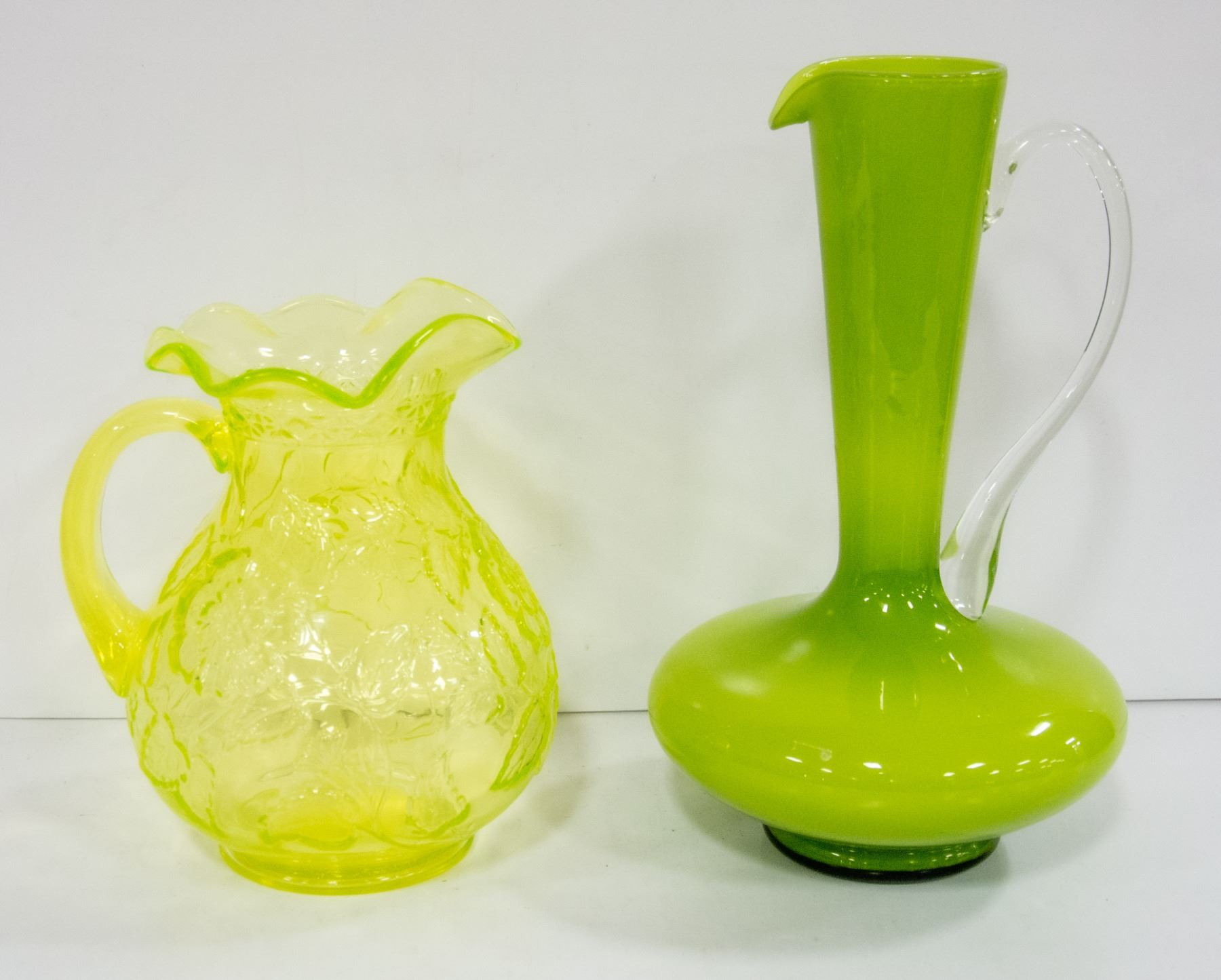 PAIR OF GREEN BLOWN GLASS PITCHERS
